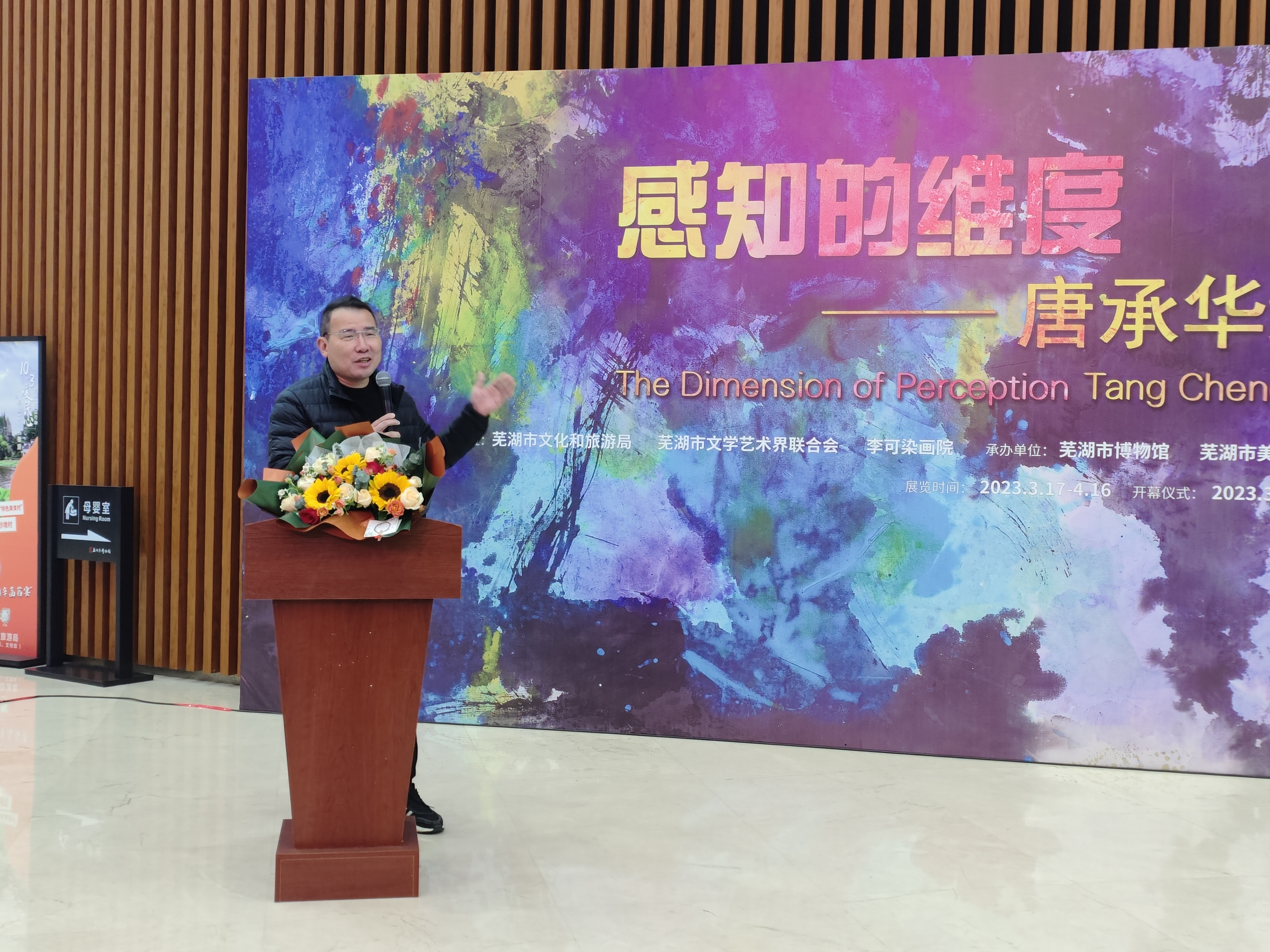 安徽省美協副主席、蕪湖市美術館館長吳曉明在致辭時表示,《故鄉》系列是形式語言、情感表達統一協調的有機整體,每一幅畫作具有血脈相連的情感底色與形式語匯。同時,每幅畫作個性張揚,生機蓬勃。每幅畫作的強大張力與生命力,不僅表現在畫作本身的形態、虛實、色彩、節奏騰挪變化,還體現在畫作彼此之間的個性對抗。這些作品就像具有自由意志的生命體,他們拒絕同質化、程式化,他們之間發生著形式對話與情感交流。吳曉明表示,好的藝術展覽,能引導觀眾追求心靈境界的提升,同時在學界應能促進交流,推動藝術事業的發展。這些是展覽學術價值的重要層面,也是蕪湖市美術館策劃此次唐承華教授展覽的意圖。
