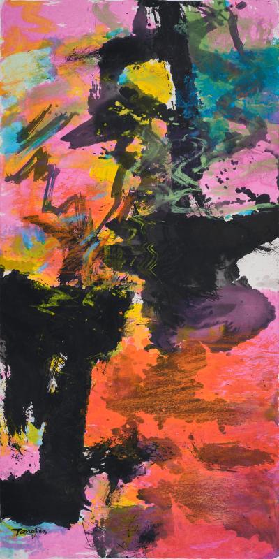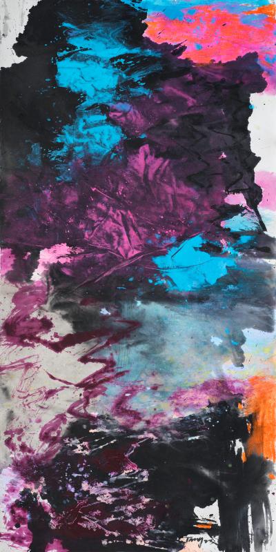 此次展覽的所有創作,唐承華沒有選擇慣用的畫布,而是使用一種產自貴州鄉間的土法手繅皮紙,這種紙在制作過程中沒有經過皮料深度過濾環節,成品極為厚重粗糙,呈半干狀滲水。這些條件,既滿足了藝術家創作過程中反復修改對紙質韌性的需求,同時也滿足了水性材料對基底層敏感性的要求。