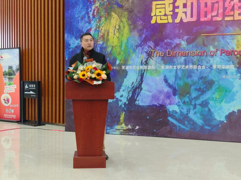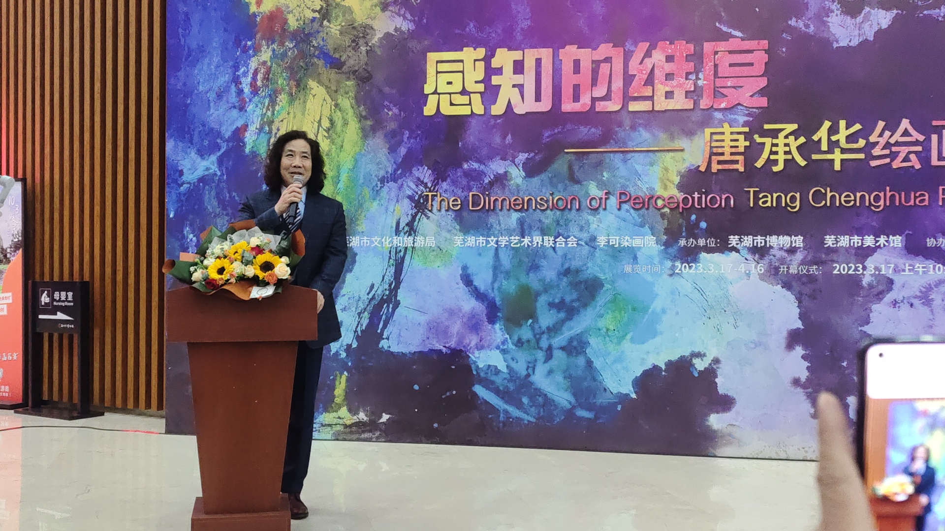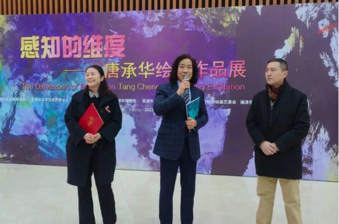 福清市文化體育和旅游局黨組書記、局長楊錦嵩在開幕式上致辭,向蕪湖市文化部門隆重舉辦此次展覽、關注融籍藝術家、推動兩地文旅事業交流合作表示感謝。楊錦嵩說,故鄉對每個人來說都是一個情結。此次展覽希望通過“感知的維度”這個具有精神意義的符號,將唐承華教授內心流動的對故鄉的情感與創作情緒,與畫作展現的視覺體驗產生的精神歸屬,進行自然結合,抒發藝術家感恩故鄉的情懷。此次展覽的作品,是唐教授花了一個月左右的時間,以“故鄉”為創作主題,在故鄉福清完成的。唐教授創作的這些作品,蘊含著他對故鄉的思緒跟情愫,他筆下的故鄉樂觀向上、充滿陽光、活力和激情,他用手中的畫筆描繪福清的意象山水,這是藝術家給予故鄉的期許與祝福。