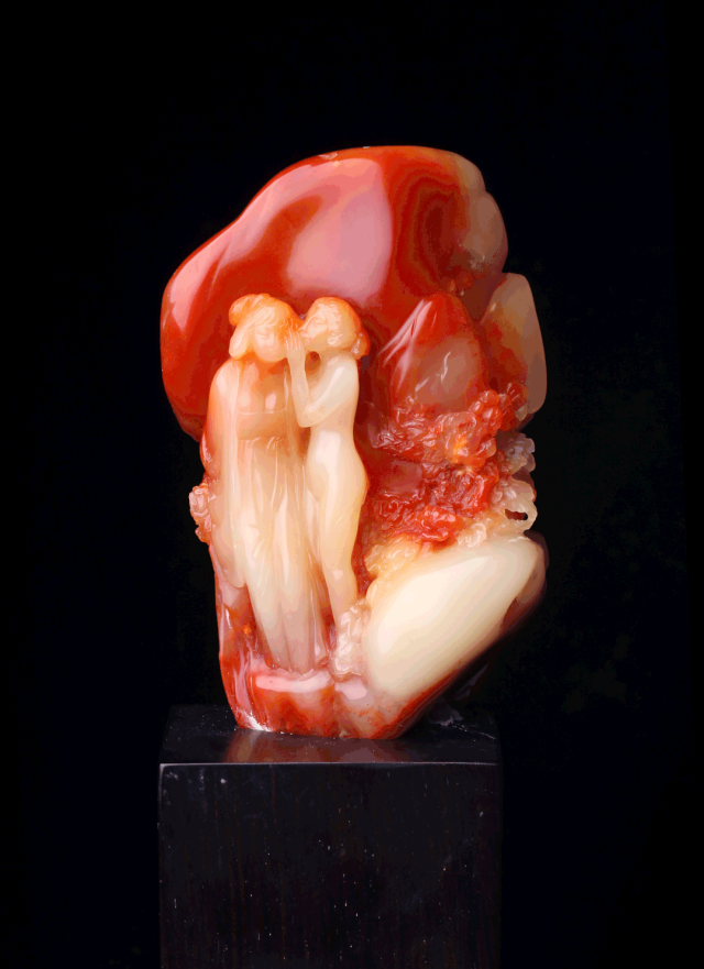 整件作品以畫入石,巧取俏色,線條靈動(dòng),刀路渾樸,細(xì)而不繁。一塊凝結(jié)脂潤(rùn)、細(xì)膩純凈的芙蓉石,兩個(gè)曼妙身姿、嬌美情態(tài)的美人,形與神結(jié)合,有情有趣,讓人從中享受到形的美感,線的意境,以及人的傳奇……