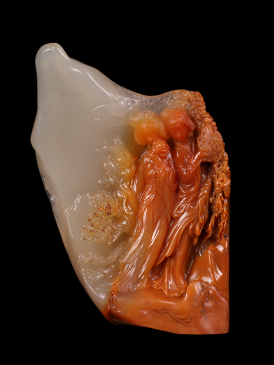 此次,他以壽山高山石為原材料,采用圓雕的技法,將“貴妃醉酒”進(jìn)行全新演繹。石上,婀娜豐腴的貴妃,圓髻松散,面容嬌俏,長(zhǎng)睫微翕,眼眸低垂,水袖輕甩,左手輕搭在侍女的肩上,似倚似靠,身姿恍惚,步履輕盈游離,朦朧醉眼中似乎還透著微醺的淺笑。