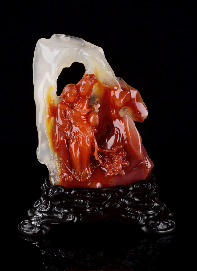 整件作品線條流暢優(yōu)美,色調(diào)對(duì)比鮮明,雕工精湛絕倫,畫面渾然一體。瓊漿、洛陽(yáng)花、絕代佳人,三者相得益彰,不禁讓觀者穿梭千年,回望那個(gè)“金屋妝成嬌侍夜,玉樓宴罷醉和春”的大唐盛世。