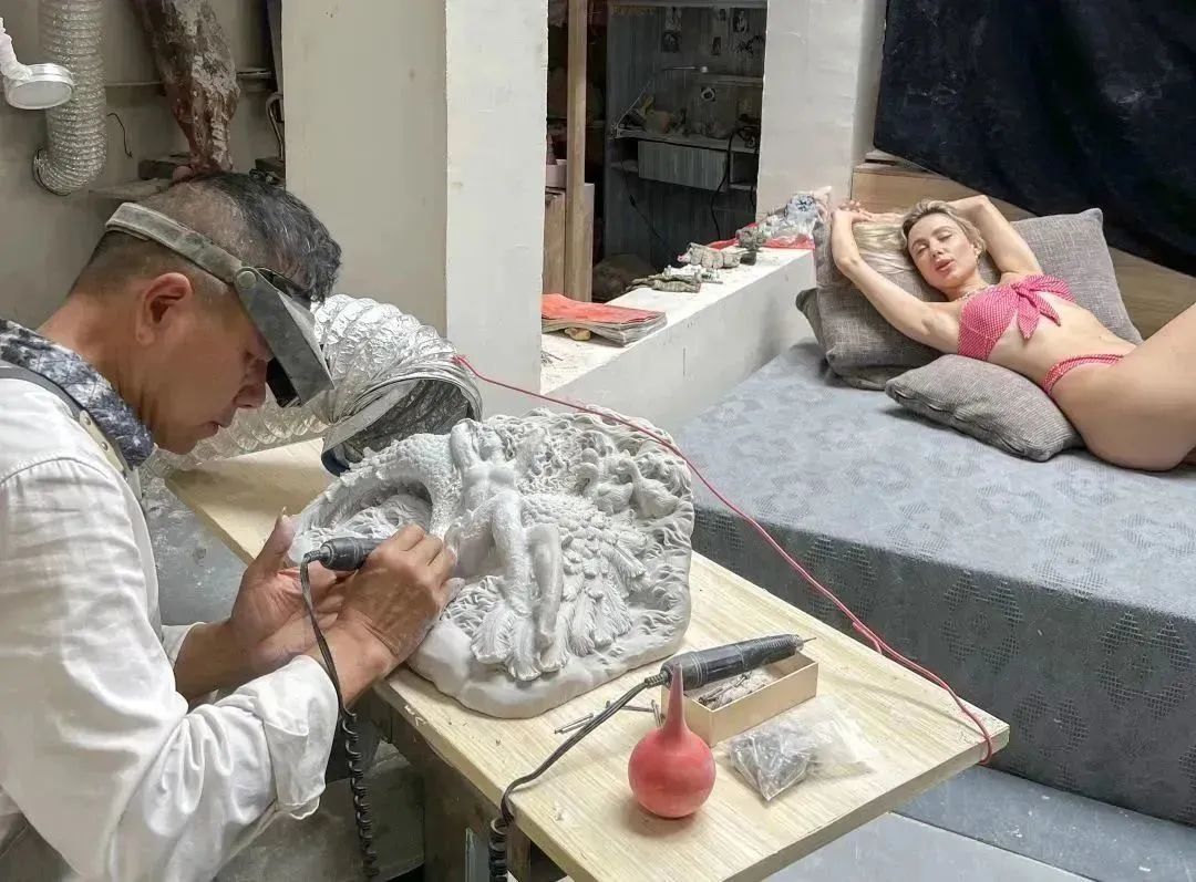 石上臥,花下眠,云間醉,山水含煙美人嬌。無(wú)論是東方的仙娥,還是西方的神女,對(duì)于刀下的美人,林飛先生似乎總能串起美的記憶,妙語(yǔ)連珠。言談間,那只叫“佐羅”的小泰迪,似乎也被話語(yǔ)吸引,一直在先生腳邊撲騰。
