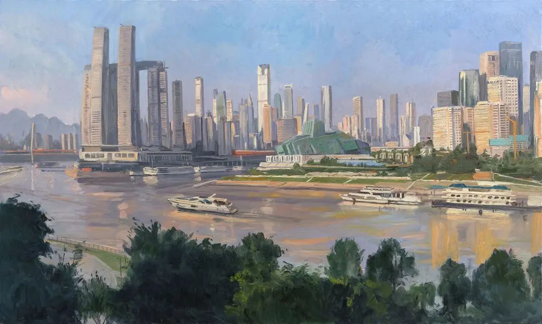 在世界會客廳一號樓的大會見廳中,有一幅超大型的油畫——日出東海,事實上這也是迄今為止中國最大幅的布面油畫。它的作者,是中國美協主席、中央美術學院的院長范迪安和中央美術學院教授劉商英。初次看到這幅畫作時,我大為震撼,一來,其尺幅巨大,會客廳的建筑又極為雄偉氣勢,二者結合,視覺上頗具沖擊力。二來,這件作品的色調迷人,以藍紫、粉橙的相交輝映描畫東海之上、晨光初露乍現的場景,明亮感之外,更有充滿期望的美感祈愿。