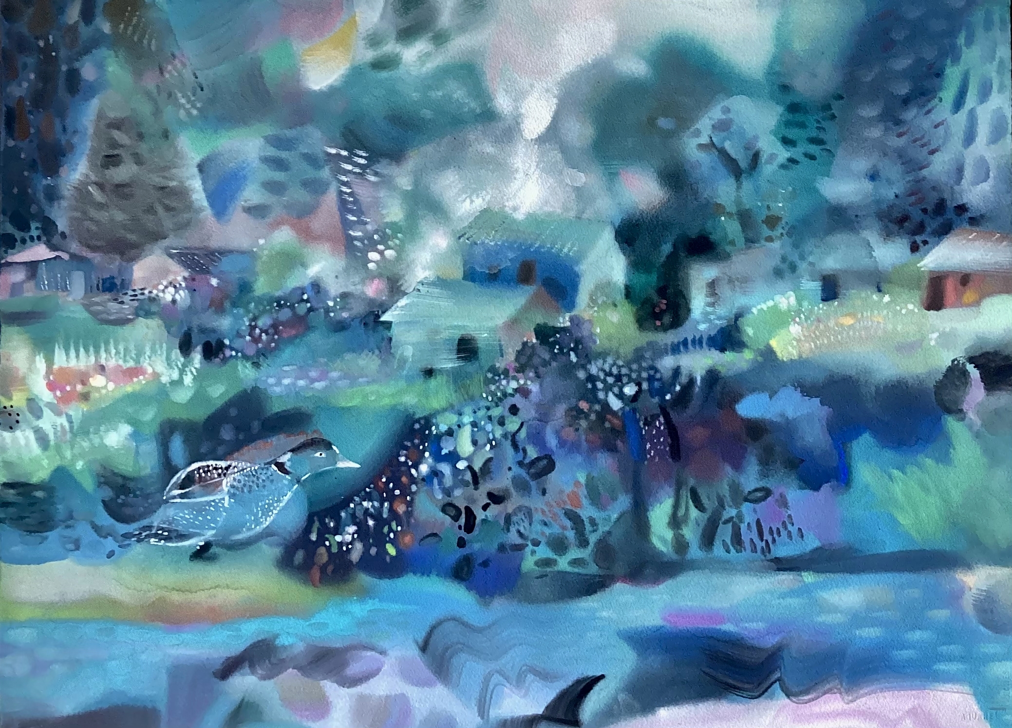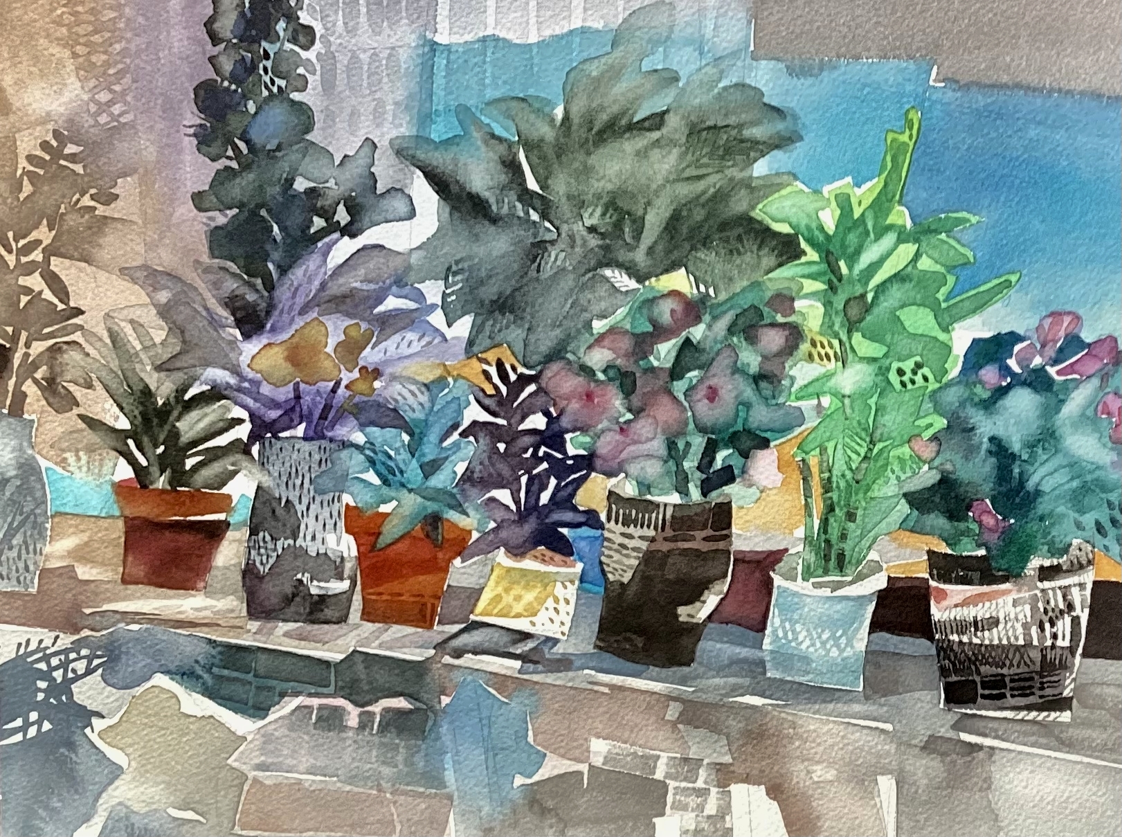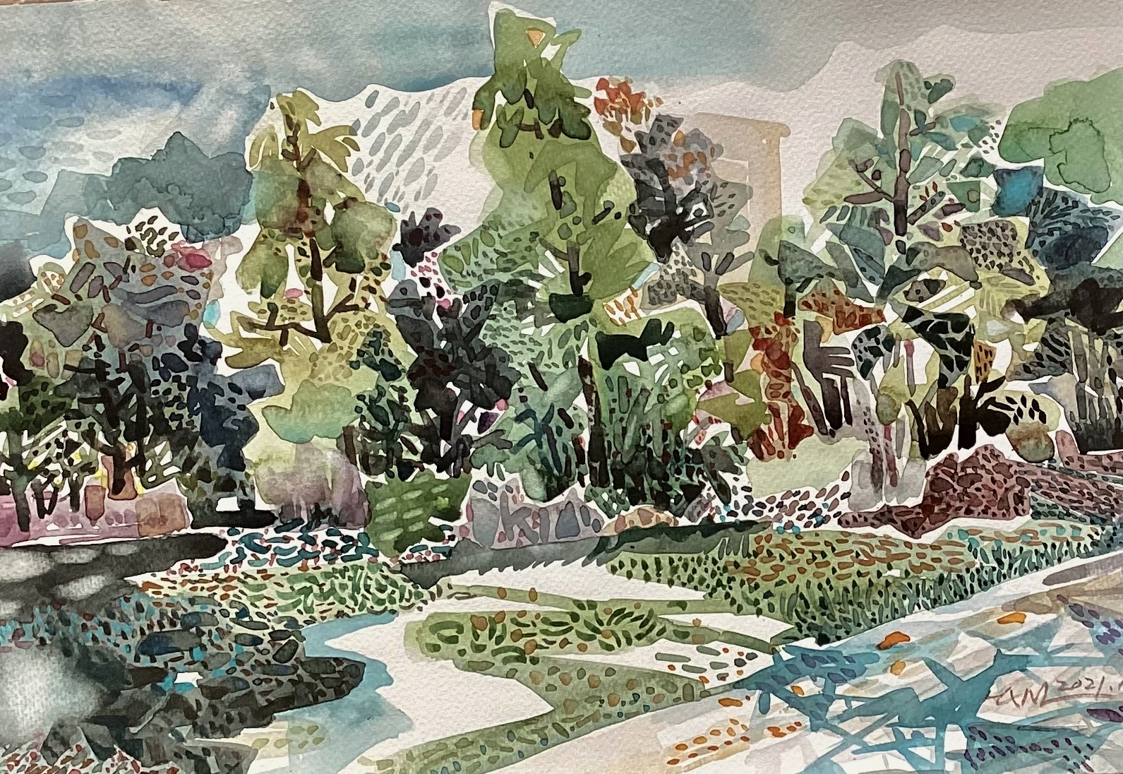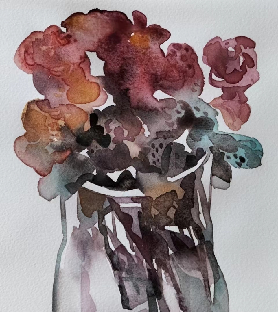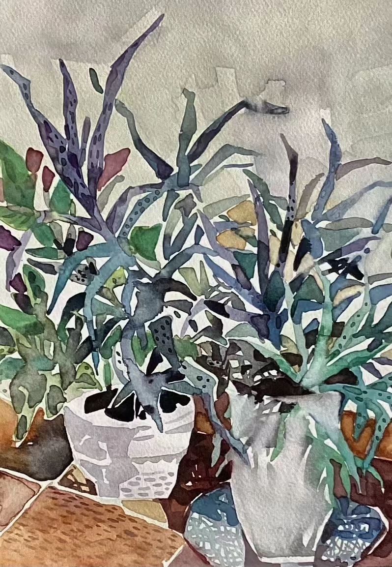 黃幸梅的水彩畫就很不一般,雖然她技法很好,但不是客觀的描寫,而是情感的抒發,想象的凝聚和主觀的表達。水彩畫本來是寫實的,水彩的技法總是通過對客觀對象的描寫展現出來。在黃幸梅的水彩畫中,用水較少的作品比較寫實,輪廓線非常清晰,形象也很準確。構圖很有特點,形象充斥整個畫面,有點像抽象藝術的滿幅構圖,不是為了再現對象,而是一種近距離的觀察,帶著期盼與觀念的觀察,表現的則是觀察的感受。如果再畫精細一些,就是超現實主義了。之所以強調這一點,就是要說明,黃幸梅的畫基本上是主觀與想象的,即使是靜物寫生,也有著超然對象的意味。濕畫是黃幸梅水彩畫的特點,用水不是玩水,水的把控與形象的把控是一致的。濕畫法本來是水彩的基礎,但黃幸梅這兒,濕畫卻有觀念的性質。在她的畫中,黑色的運用很有味道,她追求傳統水墨畫的情趣,黑色如同水墨的線條,用來概括形的輪廓和中和色彩的對比。但是,她的墨色又不同于水墨畫,由于濕底的作用,墨色塊沒有明確的輪廓,不是固定的形象,往往與周邊的顏色融合和滲透,產生一種霧里看花的效果。這似乎又是中國傳統繪畫的另一種意境。墨色與顏色在黃幸梅的畫中既是互補的,又是對應的。在力求明確的形象時,墨色起到構形的作用,而在要做意象表達時,墨色又提供了一個模糊的想象的空間。這一點與水墨畫是不同的,由于材料和技法的差異,濕畫法的水彩沒有清晰明確的輪廓線,色塊的邊緣總是向旁邊擴展,形成色與面的交錯。黃幸梅在作畫時,不是穿插干畫法來確定局部的輪廓,而是讓“水”放任自流,畫面上模糊一片,各色形等亦明亦暗,似有似無,本來是一個寫生的場面,卻像是一個想象的空間。實際上,她追求的就是這樣一個空間。她不是用水彩技巧來寫實再現,她是在有意無意地進入一個超現實的領域。墨色的運用就是有意為之,想用水墨與水彩交織,探索傳統藝術的意象。但另外三個要素又使她脫離刻意的規定,而進入一個自我的想象的世界。她的構圖是不標準的,沒有一個中心點,畫面上的東西好像是向四周擴散,目光隨意地游走,表面上是不經意地截取一個視覺的斷面,實際上是幻覺的使然。其次是線的收縮和面的擴張,這是在于她對水彩技巧的獨特理解。比如,像《惠安女》這樣的作品,雖然有一個確定的形象,卻沒有一個輪廓線,有點像水墨畫的沒骨畫法,一方面是用面的構成代替輪廓,另一方面是利用水彩的特性,將本來的線條融化為面。形象依然存在,但更多的是面的構成,有一種強烈的形式感。這種形式感既在于對象的啟發,也有她內心的意象,一種表現自我的需求。最后是色彩,看過她的畫的人,都贊嘆她色彩的鮮明與響亮,她似乎沒有顏色的顧忌,多么單純的顏色都能直接搬上畫面。她不擔心色彩的不協調,雖然不是刻意的安排,但每每在過于沖突的地方,她都會以自己的方式調解這種沖突。如《云煙》(2019),這幾乎是一幅抽象畫,補色的沖突造成色彩的強度,但穿插其間的黑色與白色不僅襯托了顏色的對比,還使得對比不那么刺眼。