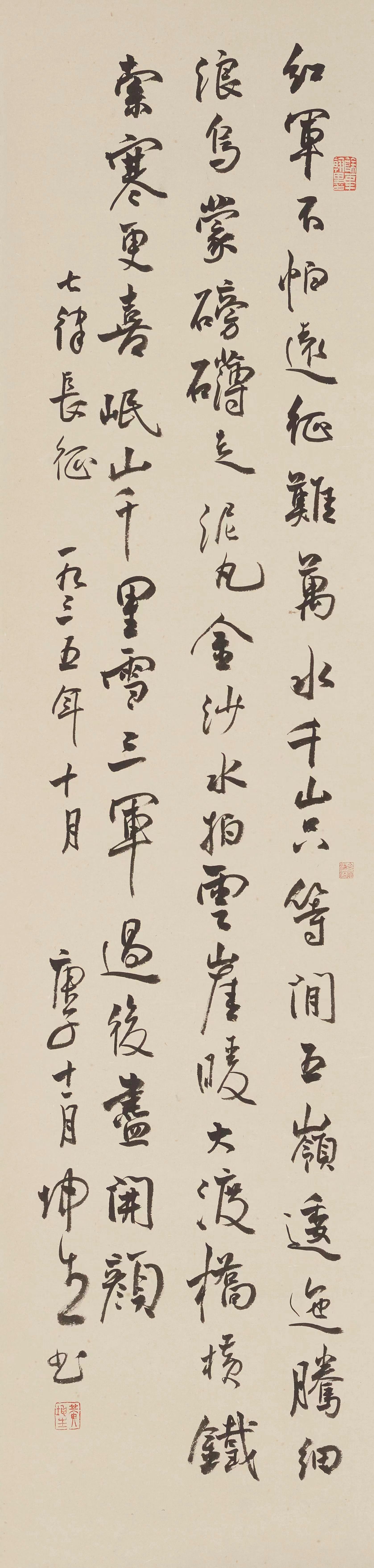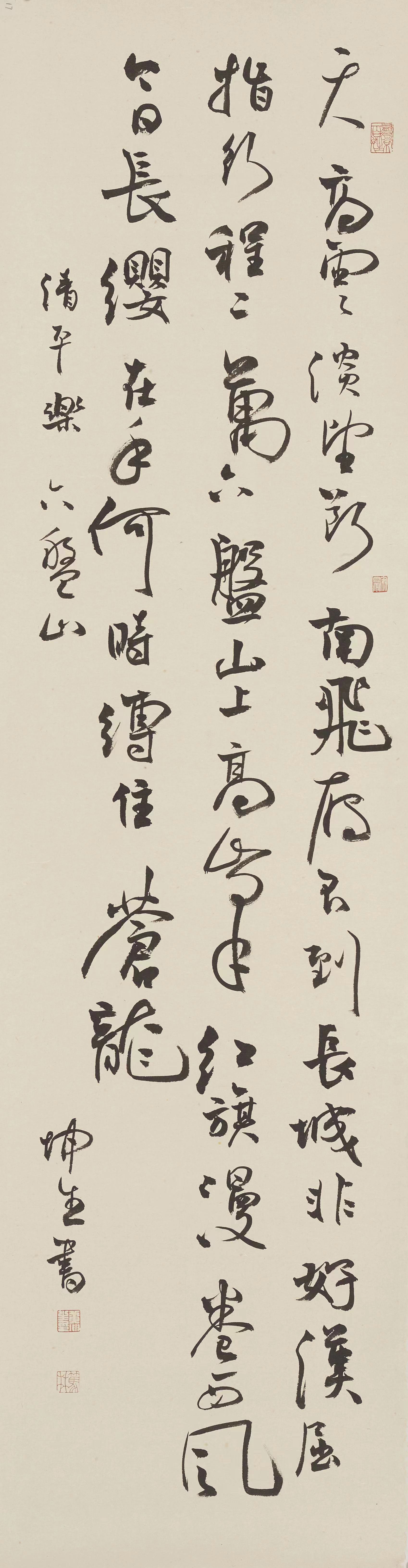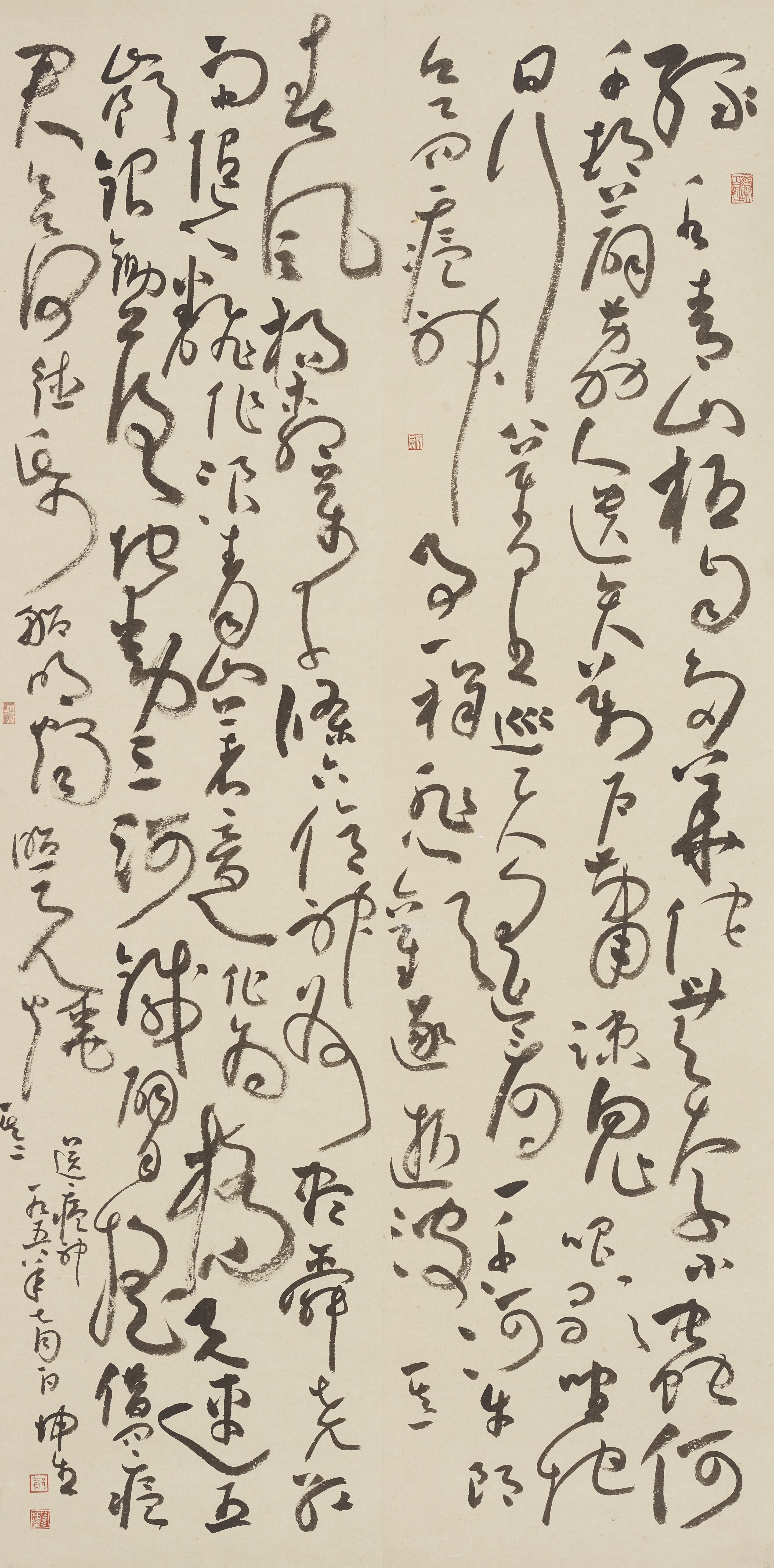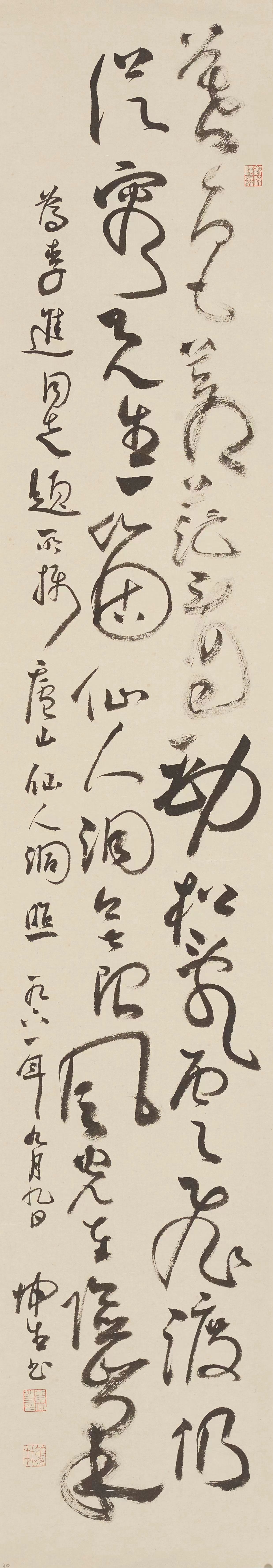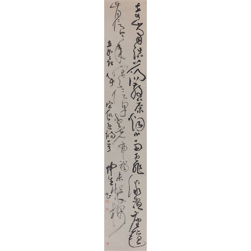 其一,大草字法的轉向。他近期的大草作品,越來越成熟地應用《自敘帖》的草書符號。草法很容易將讀者迅速帶入經典的審美記憶中,調動起相關的審美體驗。大量懷素印象的草法,一改他之前明清大草字法的自由,甚至稍感松散的結構得到了極大的改善。草法的轉變使他獲得經典審美的支撐,根連著歷史的縱深感。但是他的草法并不是《自敘帖》直接移用,而是經過吸收、變化、強化等手法,讓你覺是從懷素來,卻很難指認具體字形有多像。他的草法通融能力很強,表現得也相當出色。透過他的草法,我們還是可以看到他早年對字形變化的那種敏感,對字形空間收放對比的把握,比如《述懷》中的“開”字將上半部分放開,下半部分收緊,《立冬日野外行吟》中的“氣”也是同樣的處理方式,有些字反過來上收下放。這些字形空間變化形成的節奏,使得整個草法通透而富有變化。在立足經典,陶冶氣質中,因強化了現代空間的變化意識,就有了現代性的意味。