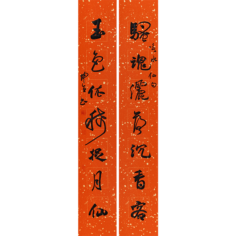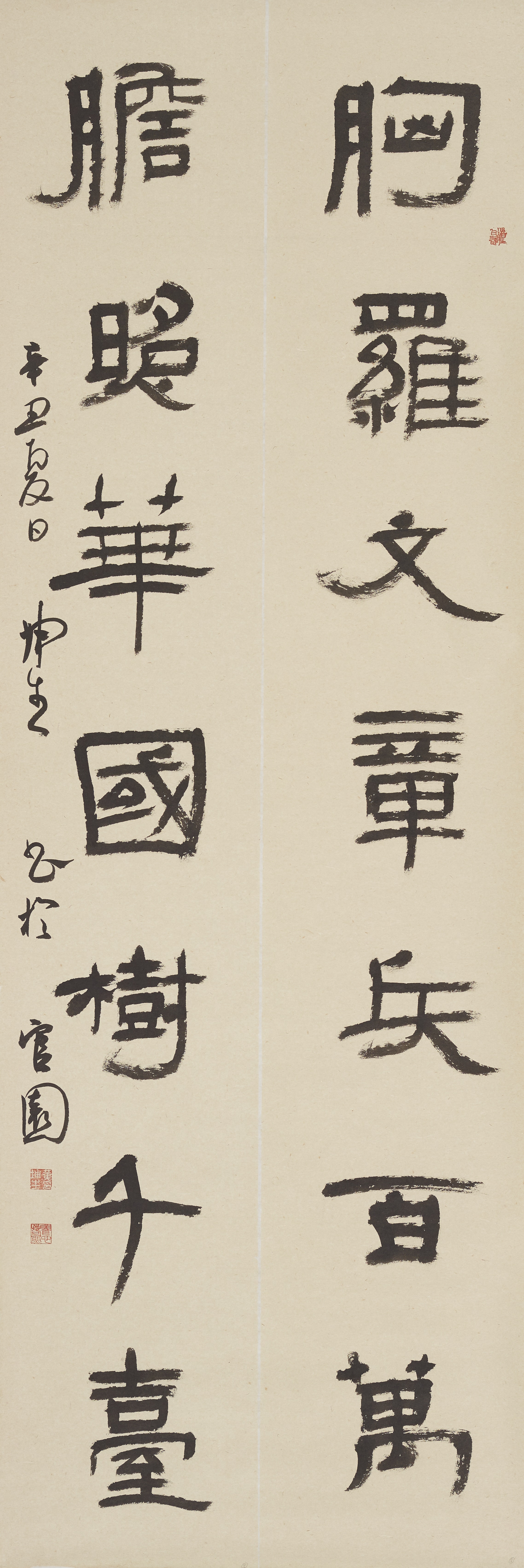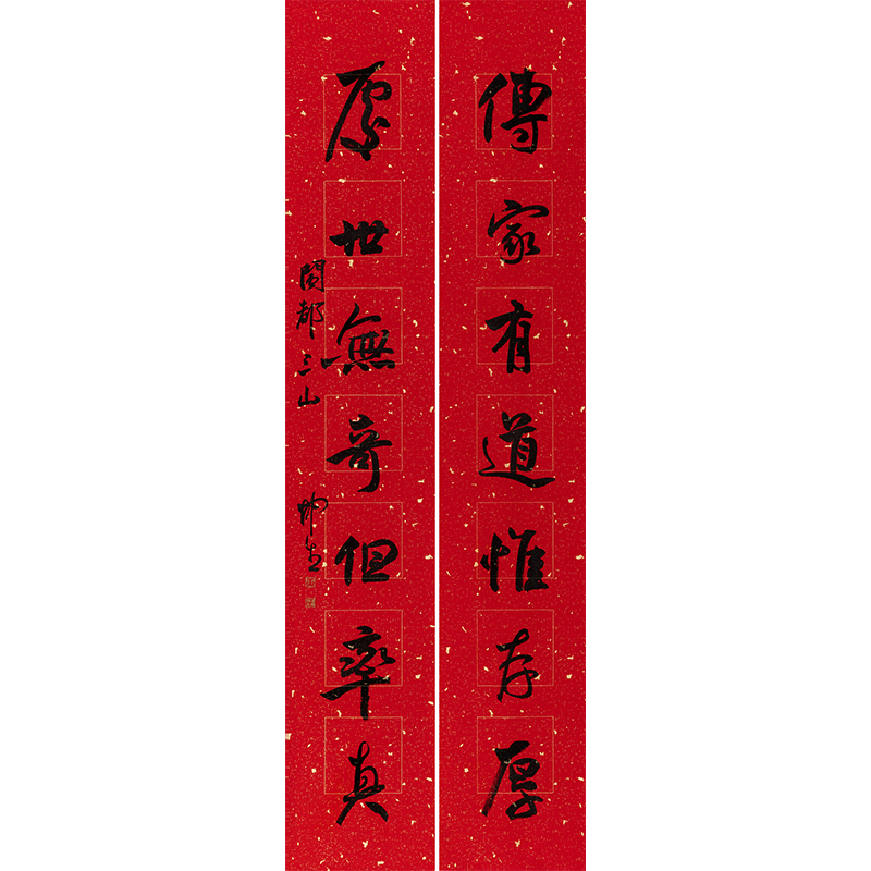 另一方面,在運筆上也改變了原來控筆中扭動運筆方向來豐富線條變化的方式,改為帖學“一搨直下”的運筆,使得線質干凈而簡練。這一改變是內在質地的改變。他對線質表達有過很深入的分析,從原來“曲”中見豐富,“曲”中見圓實,并且把持著中鋒的理念。后來他在行書中以“一搨直下”的運筆,不同于青年書法家一上手直入“二王”筆法那種純粹,這種純粹也可以理解為單一。我所看到他的幾件對聯作品,有一種執意干凈簡練的線質表達,不含雜質。這種執意我看到的是一種決心,對“二王”筆法深刻體驗的決心。也正是因為他這份執著,打開了另一扇筆法的大門,豐富了他的書法語言表達,使他的書寫有了內在傳統的縱深度。比如行書《文到?書從》行書聯,俊朗典雅,清剛挺拔的意趣別于原有張揚。