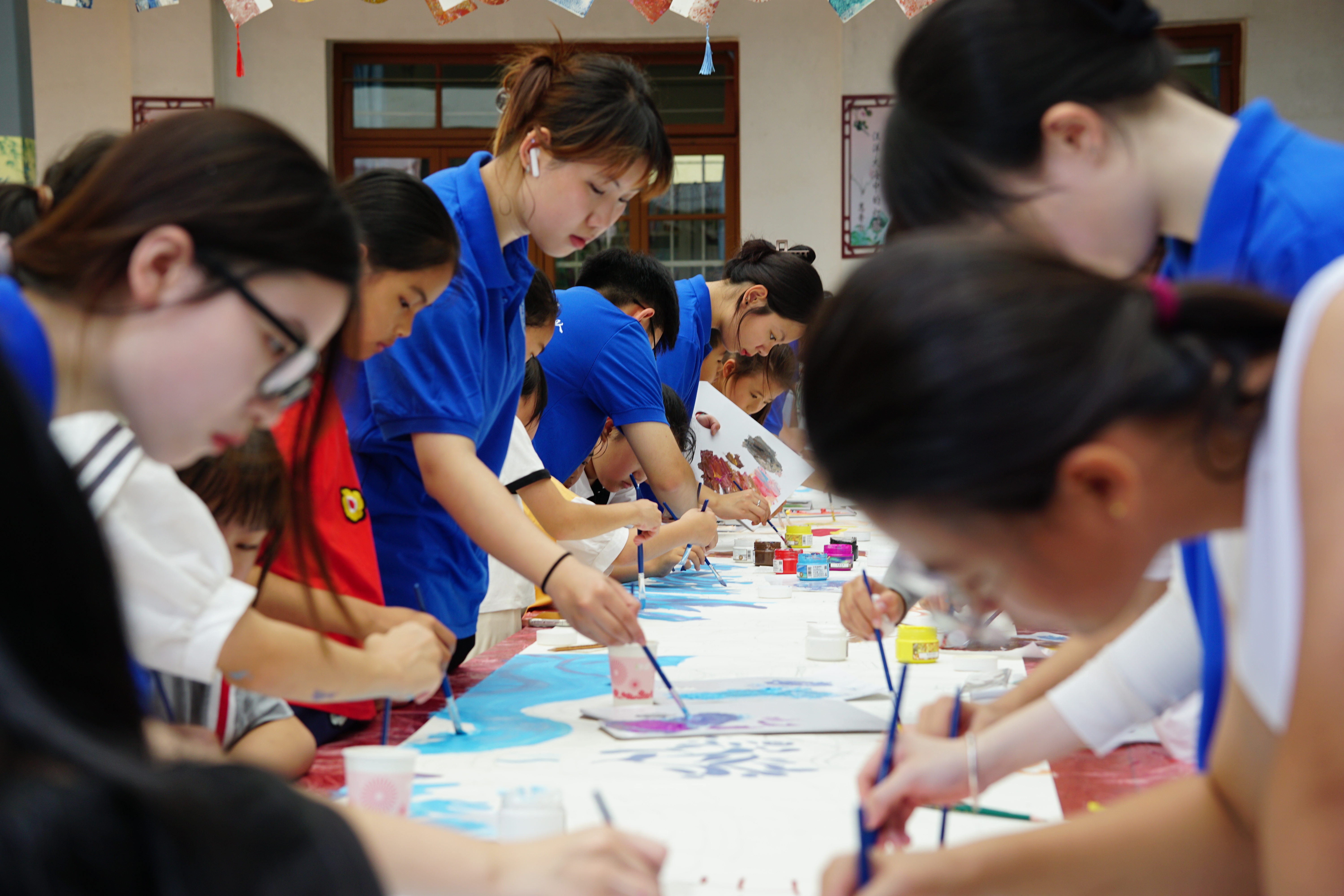7月15日,閩江學院美術學院赴永春縣蓬壺中心小學的“七彩童年?暖風支教”團隊聯合共青團永春縣委、永春縣蓬壺中心小學在蓬壺中心小學陽光書吧舉辦“童”繪“刺桐城”,共抒“海絲情”主題10米長卷繪畫活動,來自美術學院支教志愿者的大朋友們和永春縣蓬壺的鄉村留守兒童們大手握小手,“童”繪“刺桐城”,共抒“海絲情”。