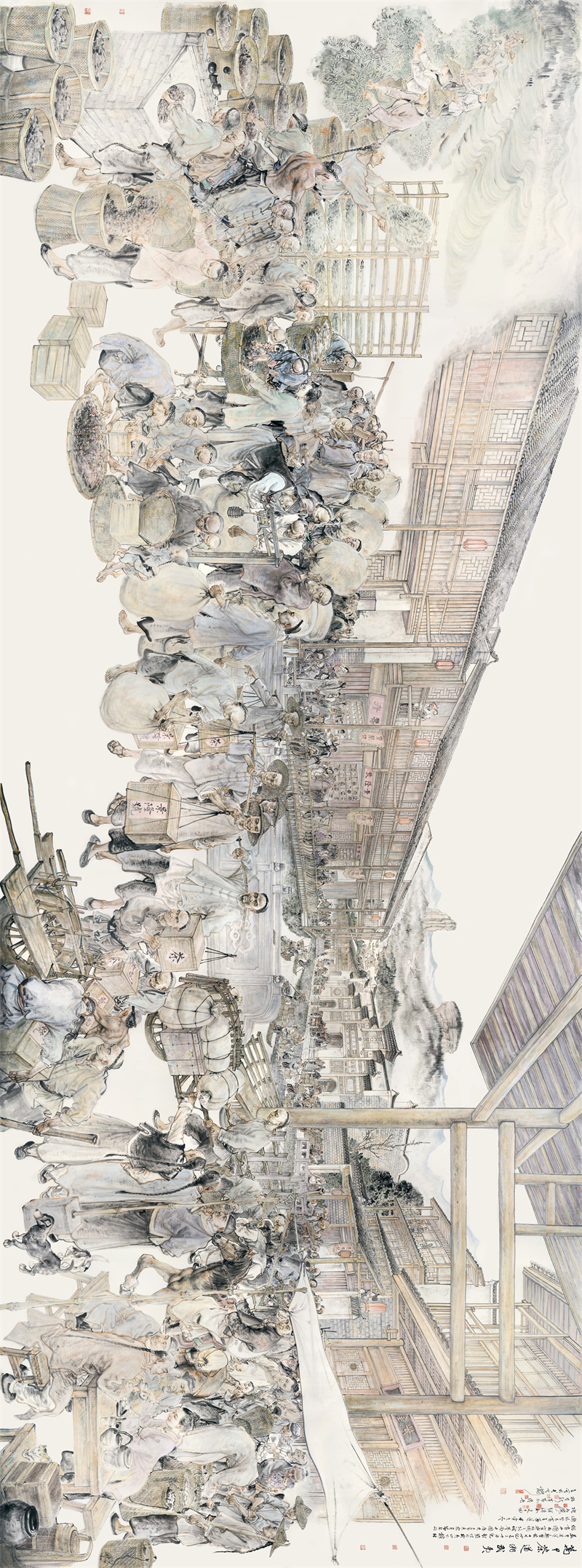 歷史的瞬間終于駐留在這里,飽滿充實又透徹流動。畫面之間人頭攢動,木樓聯排,溪流清澈,牌樓高聳,第一陣強烈的視覺沖擊之后,人們很快會察覺畫面隱含的敘事:從采青、曬青、搖青、炒青等諸多制茶工藝流程到包裝、販賣、肩挑背馱、碼頭與竹筏構成的水系運輸,彎曲的溪流遙遙指向了崇山峻嶺之外的另一個世界。畫家采用古典山水畫的散點透視,不同時空的景象并置于同一個畫面。并置不是僵化的羅列,畫面隱含自上而下、自左而右、自山而水的內在回旋,回旋銜接溪水的流向形成向北而去的開放構圖。所謂的敘事暗示出前后相隨的情節,這是意義重大的啟程——后繼的故事延續了13000公里。人們認得出,這個畫面是武夷下梅村的歷史情景再現。對于畫家說來,一個山坳之間的小村莊形成了強烈的震撼。