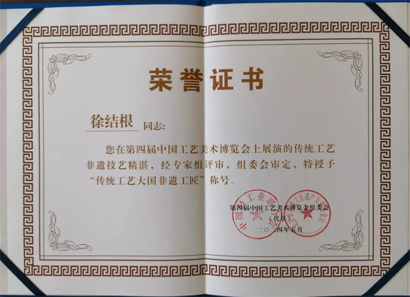 2024年5月12日,正高級工藝美術師、廣東省工藝美術大師徐結根先生榮獲第四屆中國工藝美術博覽會“百鶴金鼎獎”與“傳統工藝大國非遺工匠”榮譽稱號。