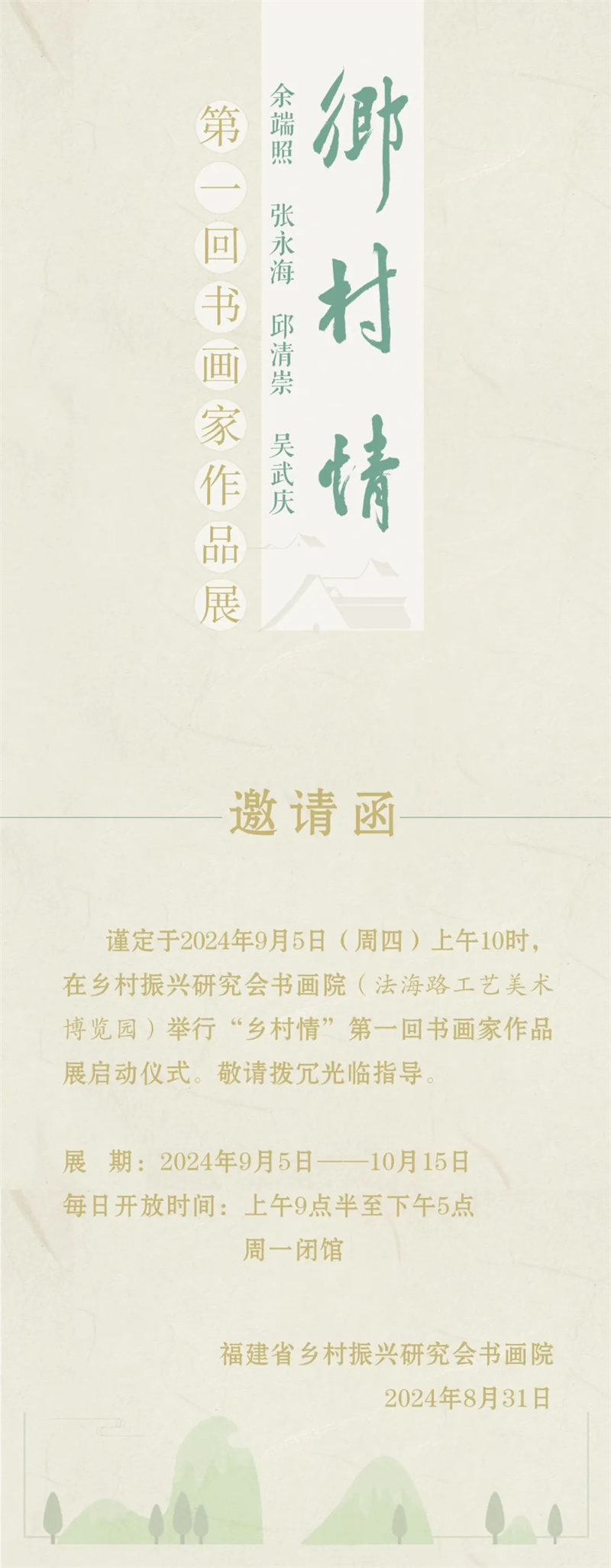 福建,這片充滿綠意與山水的土地,自古以來就孕育了豐富多彩的鄉土文化。鄉村不僅僅是文化的發源地,更是連接過去與未來的橋梁。通過舉辦“鄉村情”書畫藝術雅集,我們希望能夠喚起人們對鄉村生活的美好記憶,以及對優秀文化傳統的尊重和傳承。