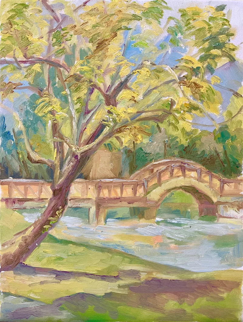 二、直接畫法與短期訓練相結合,訓練用筆與調色的準確度,強調筆法和繪畫的表現力。繪畫教學應長短期相結合,在室內進行長期作業后,應到戶外進行短期作業。季節更替,人來物往,風吹草動……外出寫生環境復雜多變,所要描繪的對象比室內復雜許多,需要有較強的主動性和提煉能力。戶外寫生時間有限,幾個小時晴天或成陰天;今日的石頭或被明日上升的河水覆蓋。捕捉不易,對于初學油畫的學生而言更是艱難。在表現形體的同時,以油畫為媒介的寫生要著重訓練“形”與“色”的統一,鍛煉用筆和形色表現的到位,做到沒有廢筆,筆筆見效。