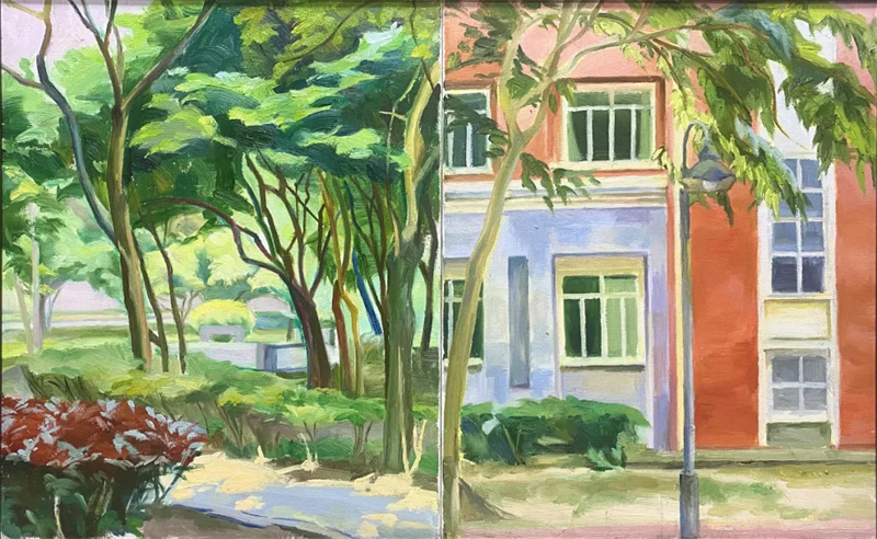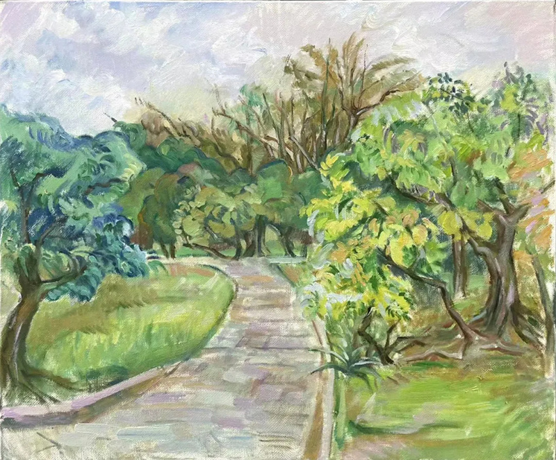 本次參展作品大多為福建師范大學美術學院2021級、2022級油畫班同學,展出的均為他們大二時期戶外現場寫生作品,共九十余幅。他們在外出寫生過程中,體現出活潑開朗、勤奮好學和吃苦耐勞的精神。作品雖然還略帶稚氣,但他們觀察細致用心,用筆真誠,虔誠探索,毫無江湖油膩之氣,十分動人。經過這一系列課程的鍛煉,在從黑白造型往色彩造型的轉換中,他們體現出極強的感受力與理解力,很快地將光色理論付諸畫面實踐,最終,他們還將帶著自己的觀察經驗和色彩素養,繼續融入到以后的創作中去,我們期盼著這份探求和追尋的發生。