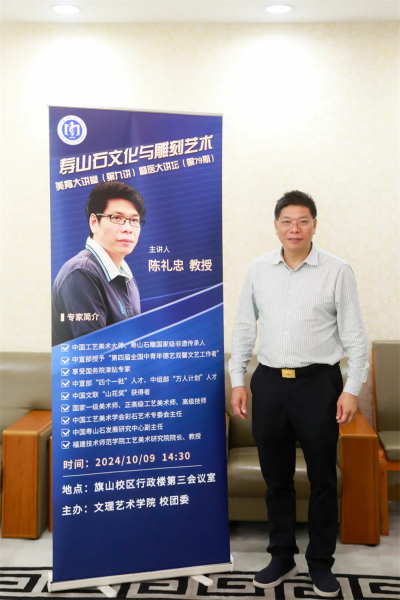 10月9日下午,福建技術(shù)師范學(xué)院工藝美術(shù)研究院與校團(tuán)委聯(lián)合舉辦美育大講堂(第九講)暨醫(yī)大講堂(第79期),特邀壽山石雕國(guó)家級(jí)非遺傳承人、福建技術(shù)師范學(xué)院工藝美術(shù)研究院院長(zhǎng)陳禮忠教授作題為“壽山石文化與雕刻藝術(shù)”的專題講座,逾200名學(xué)生聆聽了講座。