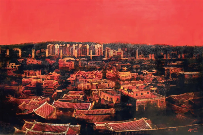 漆畫《巷弄回聲》是一幅深具情感與歷史深度的藝術 作品,旨在通過獨特的藝術形式,展現三坊七巷這一 歷史文化街區與其紅色記憶交融的歲月。