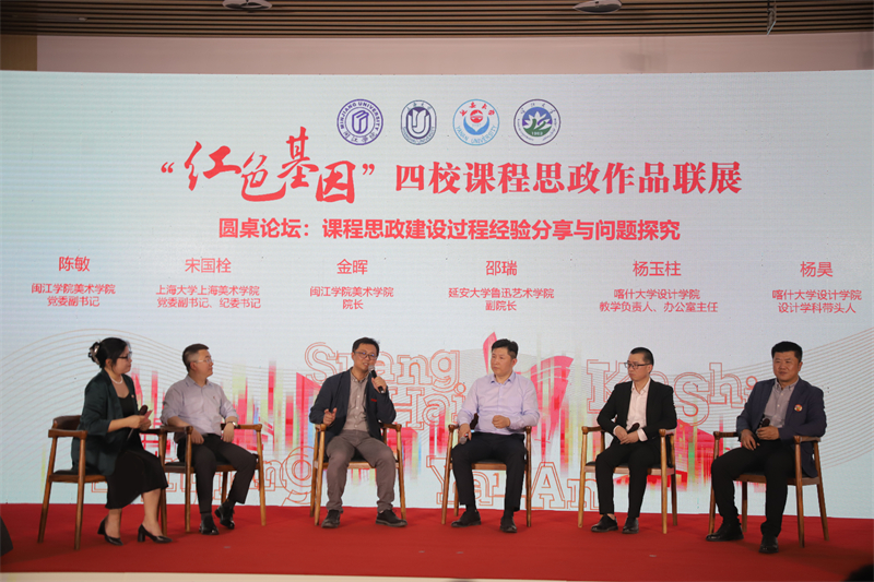 閩江學(xué)院美術(shù)學(xué)院黨委副書(shū)記陳敏主持圓桌對(duì)話環(huán)節(jié)。上海大學(xué)上海美術(shù)學(xué)院黨委宋國(guó)栓副書(shū)記、閩江學(xué)院美術(shù)學(xué)院院長(zhǎng)金暉、喀什大學(xué)設(shè)計(jì)學(xué)院教學(xué)負(fù)責(zé)人、辦公室主任楊玉柱、延安大學(xué)魯迅藝術(shù)學(xué)院副院長(zhǎng)邵瑞、喀什大學(xué)設(shè)計(jì)學(xué)院設(shè)計(jì)學(xué)科專(zhuān)業(yè)負(fù)責(zé)人楊昊圍繞“課程思政建設(shè)經(jīng)驗(yàn)分享與問(wèn)題探討”展開(kāi)跨界對(duì)話,將“紅色基因”轉(zhuǎn)化為青年看得見(jiàn)、摸得著的藝術(shù)作品,以藝術(shù)形式激發(fā)青年使命感,讓新時(shí)代課程思政建設(shè)“出新”更“走新”。