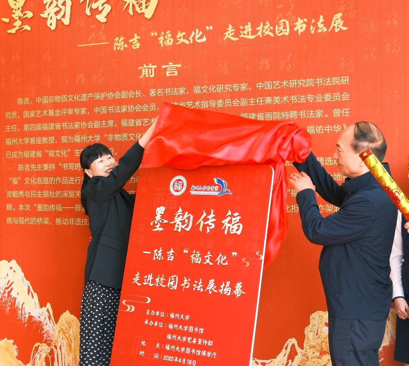 東南網藝術頻道4月19日報道(馮韻 周智軍 傅心婕 通訊員 李云雀)4月18日,“墨韻傳福——陳吉‘福文化’走進校園書法展”啟幕儀式在福州大學舉行。本次展覽展出由中國非物質文化遺產保護協會副會長、著名書法家,福文化研究專家陳吉所創作的系列“福文化” 主題書法作品,為師生及海內外書法愛好者提供交流與學習的平臺,推動中國傳統文化傳承與傳播。聯合國開發計劃署(UNDP)高級秘書関何薰珍、外籍教師、海外留學生、港澳臺留學生以及福州大學師生百余人參與活動。