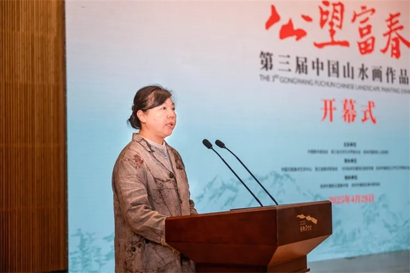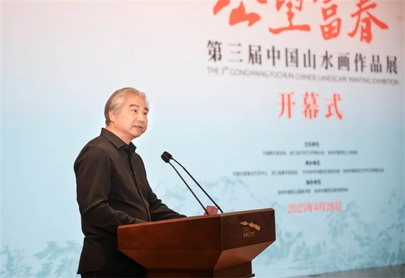 王來文在講話中指出,富陽,這片靈秀山水的土地,既是黃公望筆底煙云的永恒母題,更是新時代藝術創作的豐饒沃土,以“公望富|春”之名構建創作展陳平臺,是中國美術界貫徹落實習近平總書記倡導的“創造性轉化、創新性發展”的生動實踐、具體行動。本次展覽的作品,生動詮釋當代中國山水畫守正創新的時代圖景,特別是在“兩個結合”指引下,許多作品將傳統山水畫“可游可居”的美學理想與“美麗中國”建設實踐深度融合,讓千年文脈在新時代續寫出華彩篇章。站在新的歷史坐標上,我們要以習近平文化思想為指引,以畫為媒,深刻把握中國式現代化進程中的人文圖景,既要從黃公望“師造化、得心源”的創作觀中汲取智慧,更要踐行文藝“為人民抒情、為時代立傳”的根本宗旨,以更多彰顯中國精神、包含東方智慧的藝術創作,構筑新時代的“國風山水圖式”,為建設中華民族現代文明貢獻美術力量。
