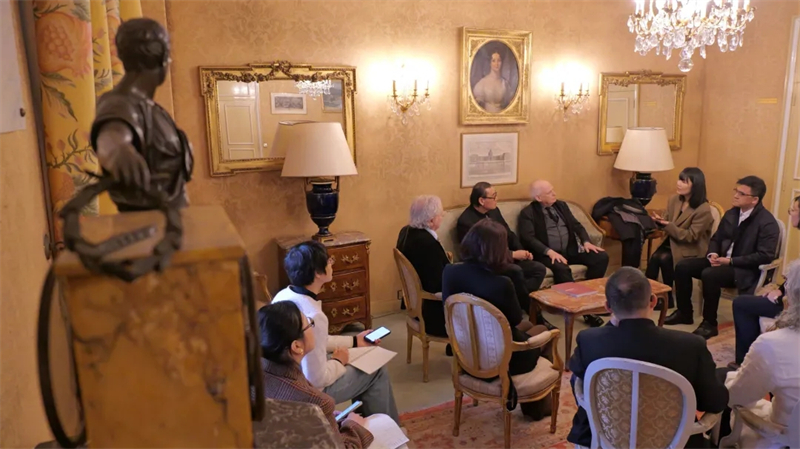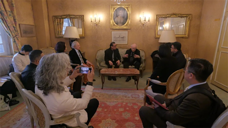 中國駐法國大使館文化處參贊王茵以及中國國家畫院辦公室主任董雷、山水畫所所長方向、交流合作部主任張楠、人物畫所專職藝術家孫震生、交流合作部干部張弦弛,中國文化傳媒集團《中國文化報》社周刊中心主任屈菡等陪同出席上述會談。
