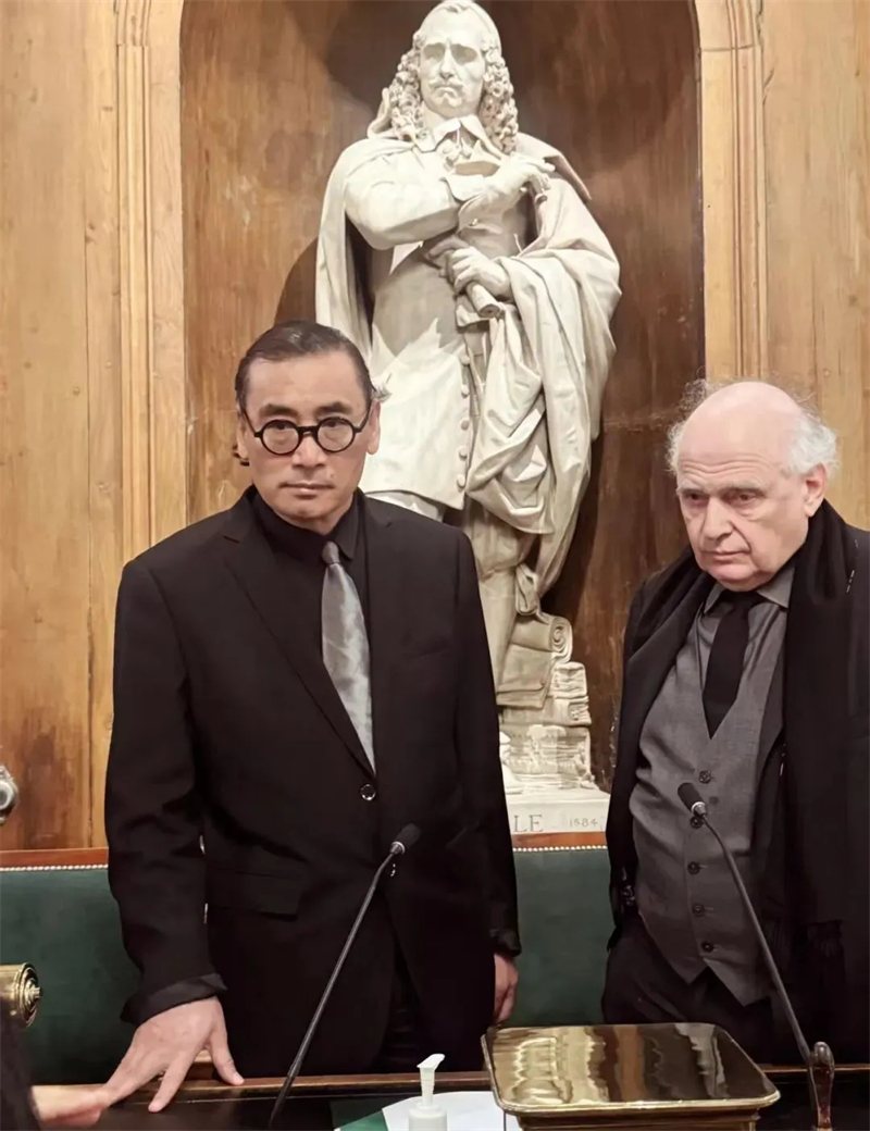 從左到右:法蘭西學院藝術院通訊院士迪?!へ惸文贰⒅袊鴩耶嬙涸洪L劉萬鳴、法蘭西學院藝術院院士、終身秘書長洛朗·珀蒂吉爾,中國駐法國大使館文化處參贊王茵