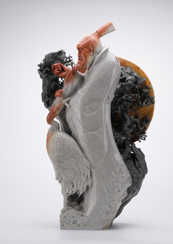 “壽山石雕講究因材施藝。”中國工藝美術大師林飛道出了壽山石雕“天工人巧”各半的創作哲學。林飛此次參展的作品《鴻運當頭》,利用石頭的形狀、色彩、紋理進行設計,巧妙運用天然紅、白、黑色,并將點睛之筆刻于鶴頂,傳遞著吉祥的寓意。林飛將院校所學的雕塑技法,結合傳統工藝表現唐詩宋詞、民間風俗等傳統文化內容,形成鮮明的個人風格。
