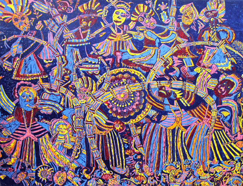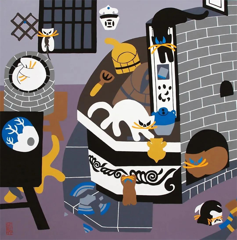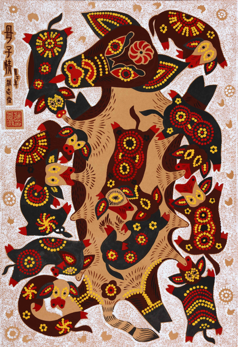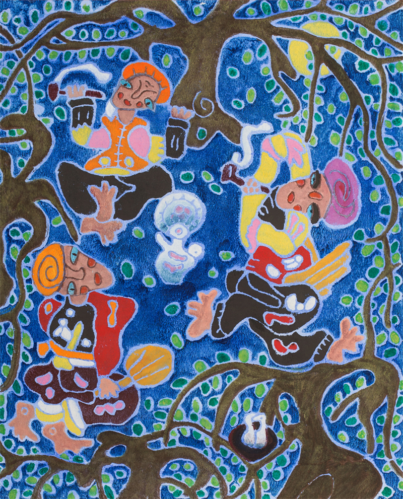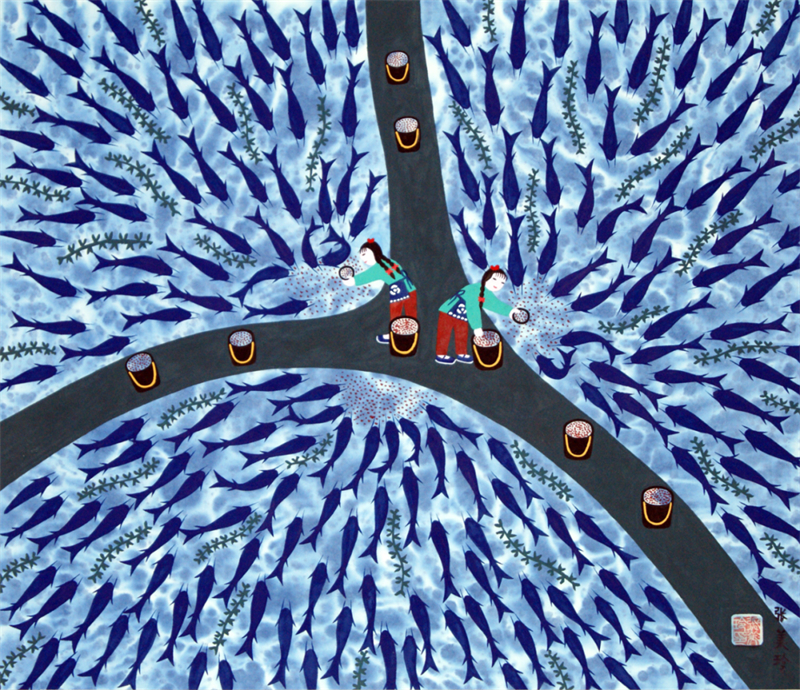 農(nóng)民畫畫鄉(xiāng)主要集中在經(jīng)濟文化底蘊深厚或民間藝術(shù)土壤豐厚的地區(qū),在七十多年的發(fā)展進程中形成了各自鮮明的地域特色。如上海金山農(nóng)民畫,汲取刺繡、剪紙、灶壁畫等傳統(tǒng)藝術(shù),把水鄉(xiāng)清新而芬芳的泥土風韻與現(xiàn)代農(nóng)村豐富的生活氣息融為一體,是在江南民間美術(shù)土壤中滋生出來的一朵奇葩;浙江舟山漁民畫風格奇幻、神秘、抽象近乎怪誕,造型夸張隨意,色彩艷麗強烈,具有濃郁的海洋文化特色;江蘇邳州農(nóng)民畫造型夸張質(zhì)樸,賦予物象稚拙生命力,色彩以紅、綠、黃等原色為主,形成強烈視覺沖擊;山東日照農(nóng)民畫以“隨心賦彩、以心造像”為理念,構(gòu)圖飽滿,色彩對比強烈,充滿積極明快的生命張力;重慶綦江農(nóng)民版畫源自明清年間的木版年畫,具有古樸稚拙、夸張浪漫的獨特風格;貴州水城農(nóng)民畫以“色彩艷麗、對比強烈”著稱,常用大紅、明黃、翠綠等高飽和度色調(diào),借鑒蠟染與刺繡的配色邏輯,形成視覺沖擊力;