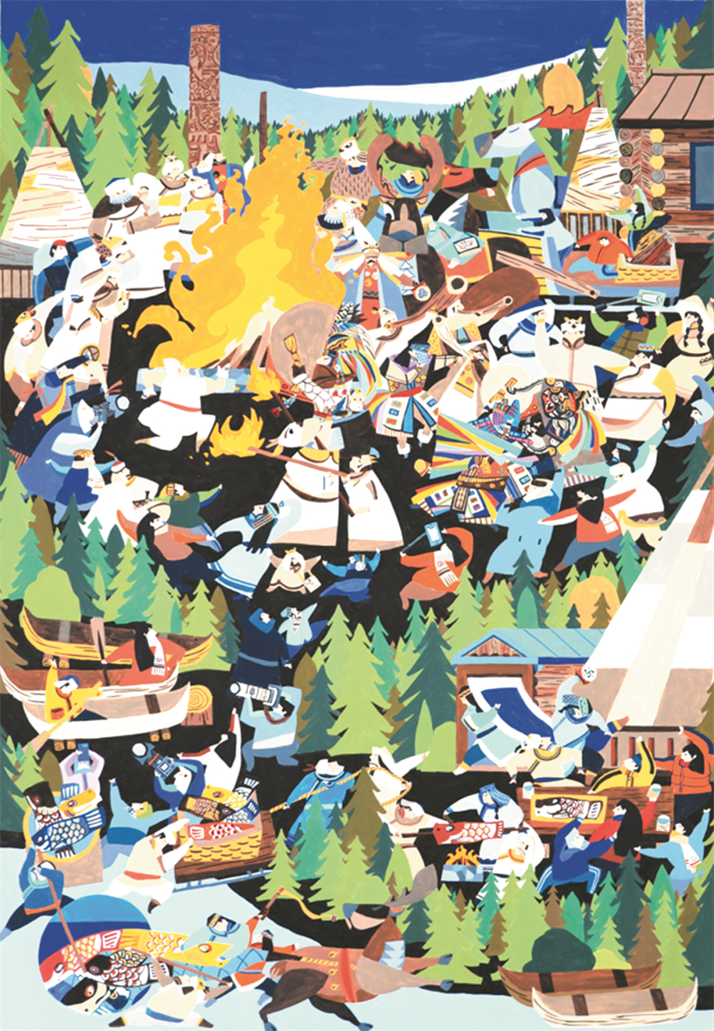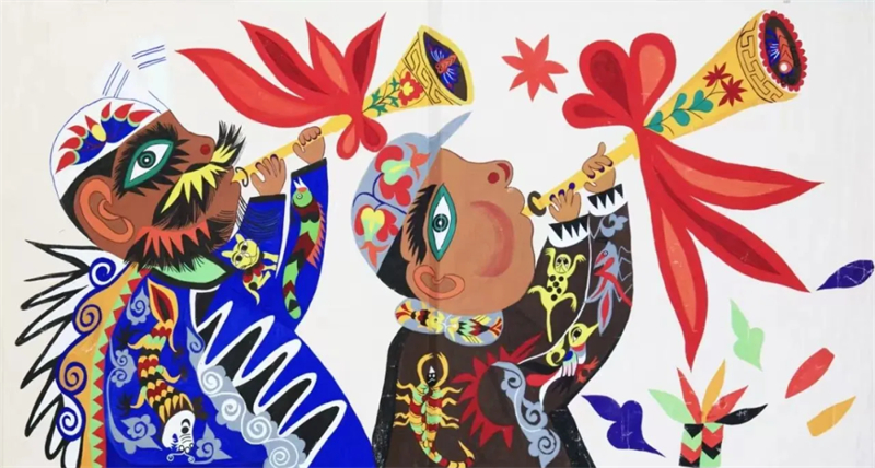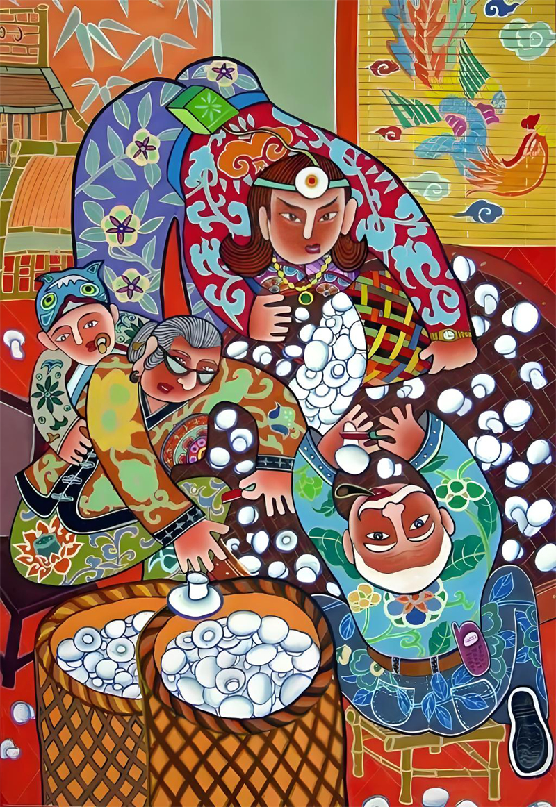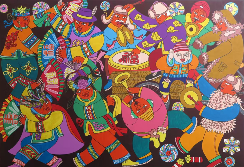 廣東龍門農(nóng)民畫結(jié)合水墨畫、水彩畫、油畫的表現(xiàn)形式,大膽運用夸張變形的藝術(shù)手法,以濃墨重彩渲染人們豐富多彩的勞動和生活;福建龍海農(nóng)民畫以夸張的人物造型、鮮艷的色彩和時空自由的構(gòu)圖著稱,題材涵蓋農(nóng)業(yè)生產(chǎn)、漁業(yè)活動和節(jié)慶習俗等;青海湟中農(nóng)民畫以漢、藏、土族等多民族文化為背景,吸收剪紙、刺繡、堆繡、唐卡、皮影等傳統(tǒng)技藝,注重整體意境表達;廣西三江農(nóng)民畫源于唐代“侗彩繪”,以其題材鮮明、造型夸張、色彩艷麗著稱,集中反映侗族人民生活習俗、社交活動、節(jié)日慶典的真實畫面;河北辛集農(nóng)民畫在技法上博采冀中剪紙、年畫、印染甚至建筑瓦當?shù)人囆g(shù)特點,畫面大膽設(shè)色,艷麗凝重,裝飾性強;天津北辰農(nóng)民畫吸收了剪紙、刺繡、草編、木板年畫等民間藝術(shù)精華,同時融入北辰人質(zhì)樸、率直、熱情、幽默的性格;遼寧莊河農(nóng)民畫從上世紀50年代的墻壁畫、70年代的莊河農(nóng)民版畫演進而來,創(chuàng)作過程中把民間剪紙、皮影、雕刻、年畫等藝術(shù)元素運用其中,具有強烈的視覺沖擊力;湖北黃岡農(nóng)民畫從刺繡、剪紙、建筑、泥塑、皮影等傳統(tǒng)習俗中汲取養(yǎng)分,將門神、中堂畫、竹筆畫、窗花等元素融入創(chuàng)作,形成了獨特的藝術(shù)風格……中國農(nóng)民畫憑借鮮明的視覺風格、深厚的鄉(xiāng)土文化底蘊和真摯的情感表達,在國際上贏得了關(guān)注、欣賞和一定的市場,是中國文化“走出去”的成功案例。