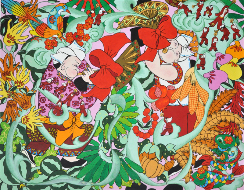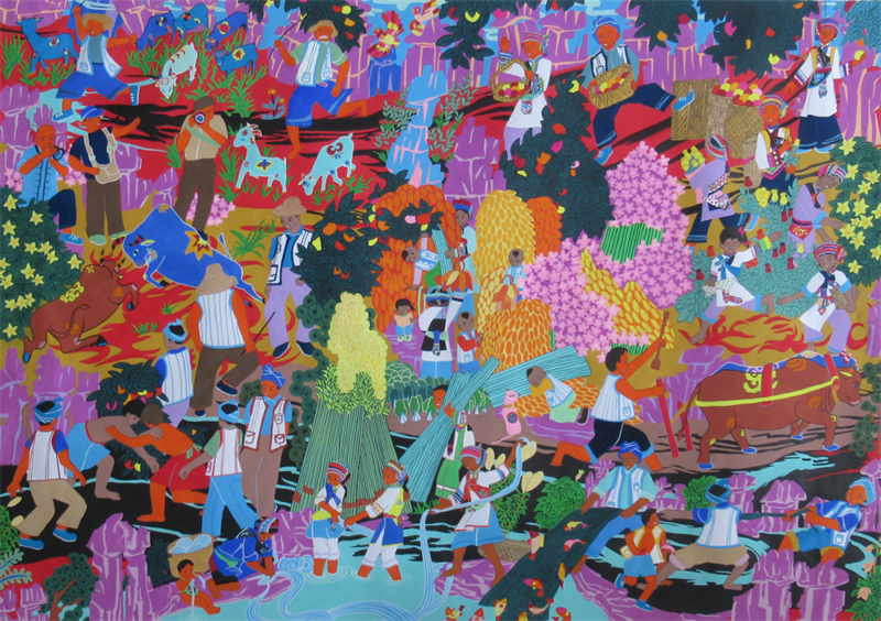農(nóng)民畫畫鄉(xiāng)廣泛分布在全國各省市、自治區(qū),從華東地區(qū)的江蘇邳州、徐州,上海金山,浙江舟山、秀洲,福建晉江、龍海、同安、漳平,江西湘東、蘆溪,山東日照;到西北地區(qū)的陜西戶縣、安塞,青海湟中,寧夏隆德,新疆麥蓋提;從華北地區(qū)的河北辛集,天津北辰,山西代縣;到東北地區(qū)的吉林東豐、樺甸,遼寧彰武、莊河,黑龍江綏棱、賓縣;從華中地區(qū)的河南內(nèi)黃、舞陽,湖北黃岡,湖南常寧、隆回;到華南地區(qū)的廣東龍門,廣西三江;到西南地區(qū)的云南省官渡、騰沖,貴州水城,重慶綦江,四川井研縣……質(zhì)樸的農(nóng)民畫作者不受專業(yè)技法的束縛,卻以最真摯的情感、最鮮活的視角,描畫熱火朝天的鄉(xiāng)村生活,表達對幸福生活的美好憧憬,讓農(nóng)民畫在美術(shù)百花園里綻放出獨特的光彩。