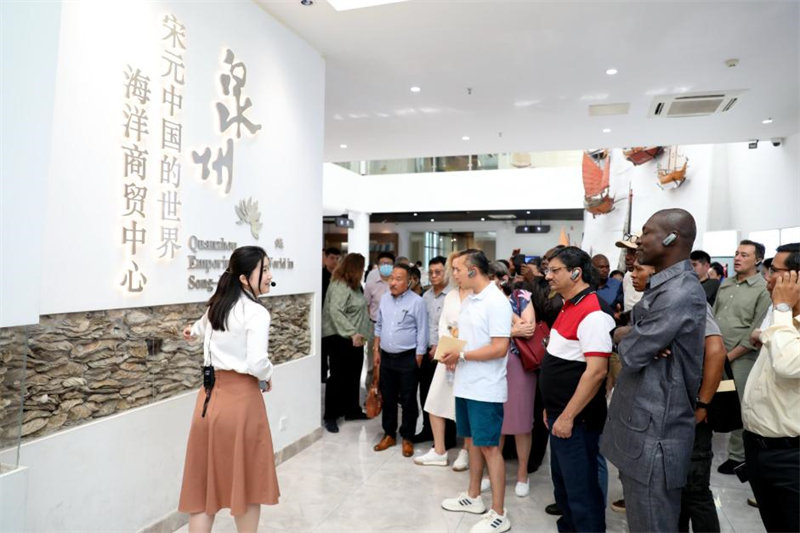 在泉州海外交通史博物館,活動一行深入了解海絲文化,在古老而生動的歷史遺存中,觸摸泉州源遠流長的歷史文脈。拉斐爾·圖朱、西迪·西塞、布帕爾·拉伊等參觀者們被宋代福船模型、明代航海圖等物件深深吸引,領略到宋元時期泉州開放多元、包容大氣的海洋文明與城市精神,紛紛驚嘆于古代海上絲綢之路上空前繁盛的海外貿易和文化交流。