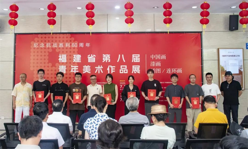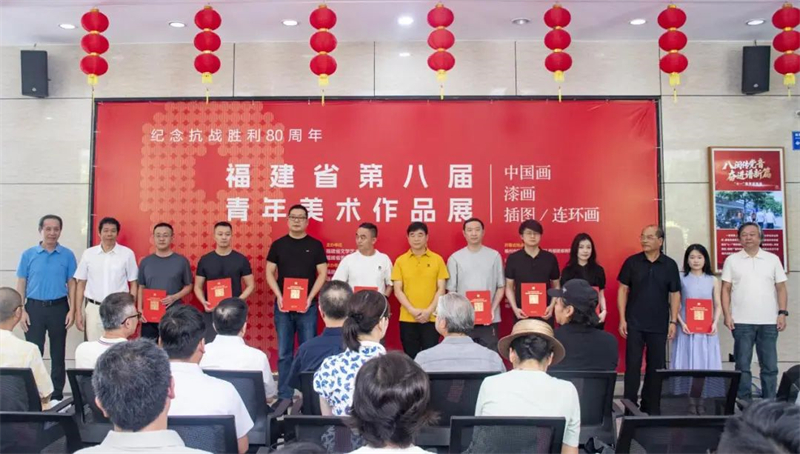 開幕式上舉行了“紀念抗戰勝利80周年——福建省第八屆青年美術作品展”頒獎儀式。張帆、李東河、王來文為一等獎作者頒獎。