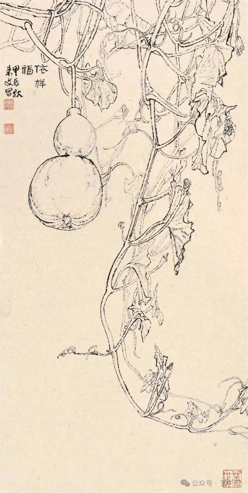 掛枝葫蘆是來文先生多畫者。與過往絕大多數畫家只畫落地葫蘆不同的是,他選擇藤上掛枝葫蘆,不僅在于熱愛對景寫生這種方式,借助表現果實與枝葉的關系來傳遞勃勃的自然生機,更重要的是要通過描寫葫蘆與纏枝來突顯線描豐富細膩的表現能力和魅力。他用濃淡不同的墨線編織出枝蔓自由垂曳的勢態,用枯筆輕搓慢擦葫蘆邊沿帶出其特有的質感,更用焦墨點提部分虬直枝葉的葉角和莖脈,生氣、精氣和神氣因為墨線的濃淡焦枯變化而由里及外的播散出來,令人陶醉。落款甲辰秋來文寫畫的《福祿吉祥》尤為上品,其焦墨對枝葉的局部提寫透露出藝術家對自然生命的肯定和禮贊,飽滿的情緒盡在其中。