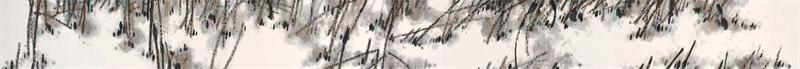 來文對荷桿形與勢的書寫性表現,為整個畫面夯筑起審美情感的心理結構。一幅橫闊延展的畫面上,綠葉漂浮滿園,而荷桿卻猶如船桅,在夏末的渚水里林立交錯。平直的斜線、折線與平圓的荷葉形成動靜變幻的節奏,雖有主觀故意,卻宛若天作。藝術家更是創造性地自左而右逐漸減少留白,讓橫向驚人跨度的畫面舒緩而有變化,似是由遠及近的對角斜線,實則人景無邊的平遠空靈。葵卯年創作的《秋實》,最是令人稱道叫絕。畫幅極度寬展,取景膽大出奇,視角獨一無二。秋實之意在于大地,在于根莖,在于光鮮的歸處,而不在蓮蓬,不在高遠、平遠和深遠。對大地的俯察,即是對自然母親的禮拜;對根莖的留意,即是對來年復蘇的期許。秋實的豐盈及其之后的肅殺,是新的生機的開始。沒有永遠的繁花和美果,周而復始的循環往復,才是大自然永恒的樂章。草草切切的墨點與枯筆,短促有力,似意生命的不屈。倒伏跨越的長線,將敗葉與折枝貫通起來,正是生命周期的綿延。如此巨大尺幅的橫軸,未寫一物,卻勝似全景。秋風愁煞處,更是明日人間。