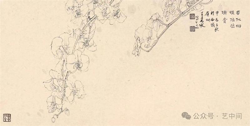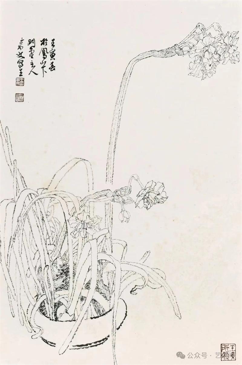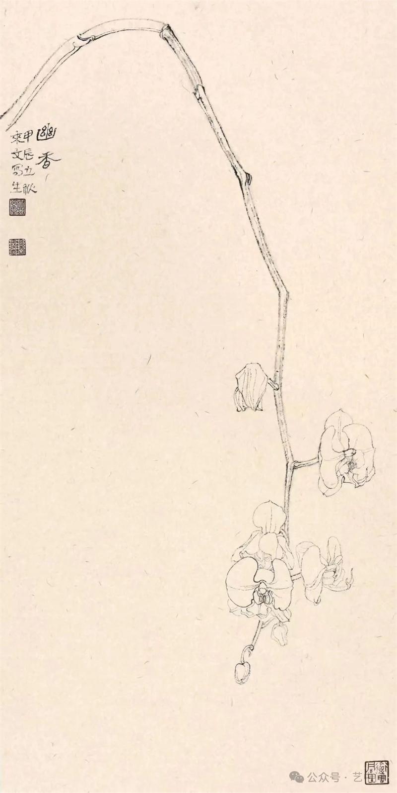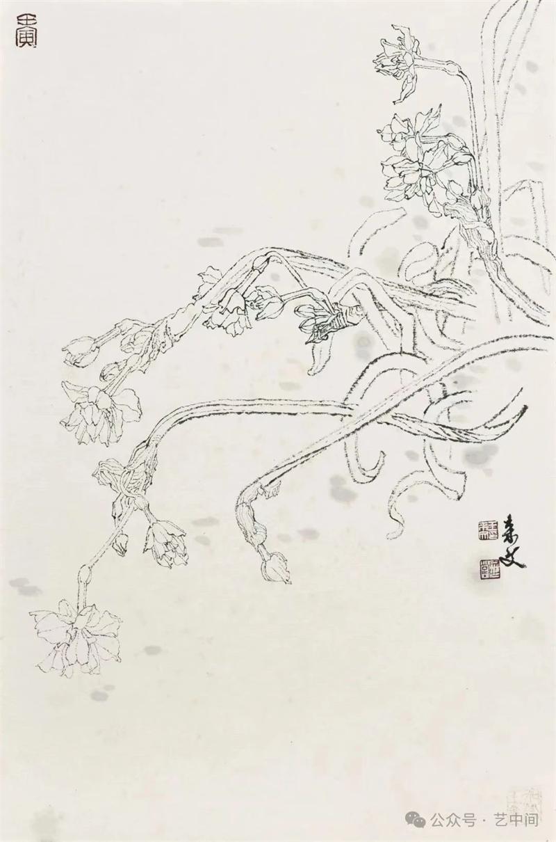 與古人的白描侍女、神仙和山水居多不同的是,來文的白描獨選花草。花草本是自然和現實環境中姹紫嫣紅、繽紛斑斕的代名詞,選擇用墨線的輕重緩急、曲直逶迤和濃淡干濕來表現花草的豐富視覺魅力和情感濃度,這無疑是對自己的藝術創作提出了極大的挑戰。當然,它也對觀賞者的審美鑒賞能力提出了極高的要求。