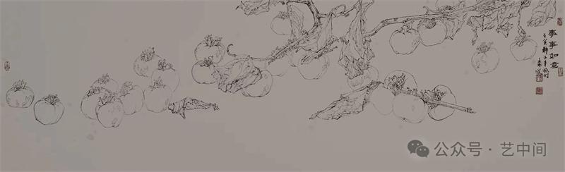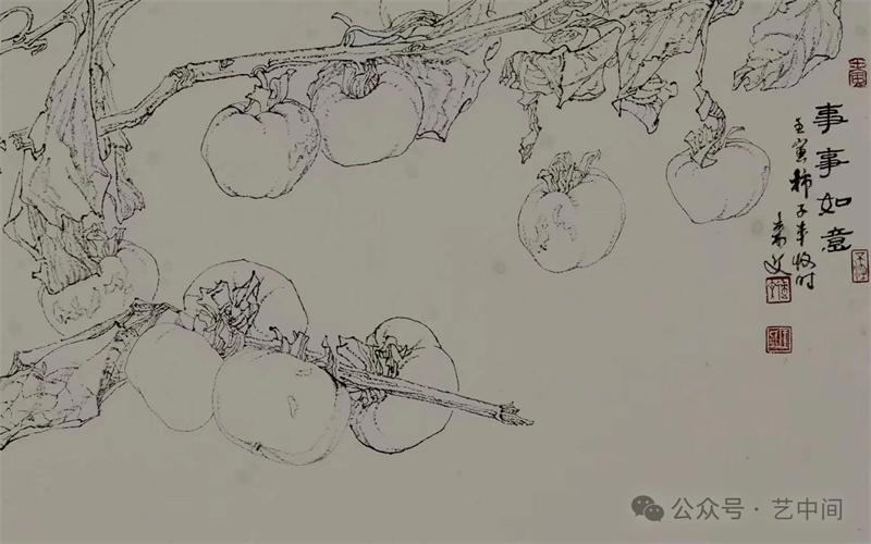 來文的白描畫以近景和小景體裁描寫花草果蔬,這既是向中國傳統花鳥畫中折枝畫的構圖取景審美方式的致敬,又是為了保證單支或局部花草果蔬的形象和姿態不被錯綜復雜的現實環境景物所干擾。他的《事事如意》表現豐收的柿子可謂匠心獨運——橫軸的畫幅里,不是柿滿枝頭,也不是遍地柿陣,而是由畫幅右上方畫外伸進畫中的三兩支結著果實的樹梢。在其周圍依右上而左下,散落著一些熟透了的柿子。這種由畫外破入的對角線式景物構圖,既增添了畫面的變化,又因為橫長豎高近4比1的畫幅比例,而保留著平穩,傳遞出安寧富足的喜悅之情。雖沒有色彩的烘托,但濃濃的秋收果香卻如若親嘗,而這全仗畫家摸索出的拖筆勾枝和枯墨皴擦的線描手法。他用濃淡變化的干筆勾勒出柿葉的曲直,用枯筆打底出秋葉的向背;又用圓中帶方的輪廓描寫和澀筆不利的表面圈斑手法,體現深秋果實的圓熟。