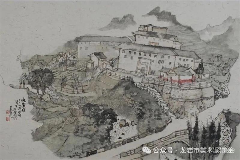 藝術家們懷揣對傳統文化的敬畏之心,扎根永定厚重的文化沃土,以多元的藝術視角與精湛的創作技法,為永定土樓注入鮮活的藝術生命力。在筆墨揮灑間,初溪土樓群依山傍水、層疊起伏的壯闊畫卷徐徐展開;振成樓融合中式飛檐與西式廊柱的精巧細節被細致刻畫,盡顯中西合璧的建筑智慧;承啟樓 “高四層、圈四圈” 的恢弘格局躍然紙上,讓人直觀感受客家建筑的磅礴氣勢;南溪土樓溝延綿十余公里的悠遠意境,在水墨暈染中化作流動的長卷,將土樓與自然的和諧之美展現得淋漓盡致。創作既注重建筑與自然的空間對話,也生動表現土樓人家炊煙裊裊、耕讀傳家的生活場景,在筆墨點染間凝聚客家民系艱苦奮斗、敬祖重教、愛國愛鄉的精神史詩。