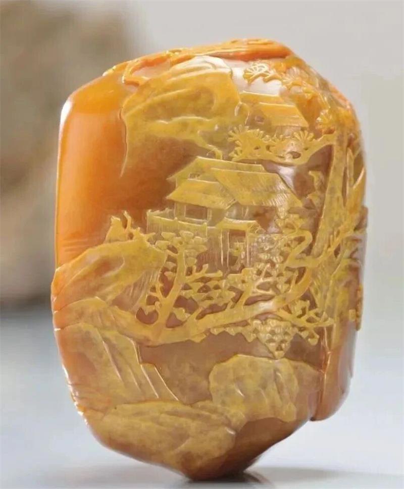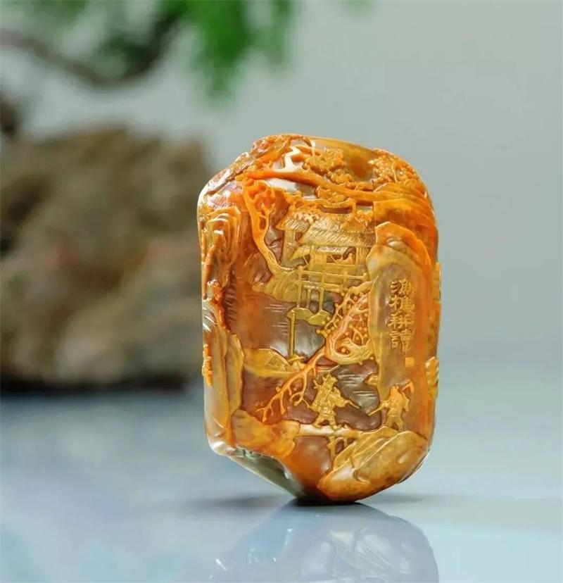 從作品造型來看,其形制飽滿圓潤,色澤內斂含蓄,石皮斑駁,散發著雅致高古的獨特韻味。林文舉大師巧妙借助石材肌理,精心雕琢出巍峰窮谷,塑造出峭拔嶙峋的磅礴氣勢。畫面中,遒勁老樹、邈絕磴道等元素點綴其間,整體呈現出秀美之態,營造出與世隔絕的靜謐氛圍。中間留白處以短線勾勒水波元素,一潭湖水躍然眼前,為畫面增添了靈動之感。