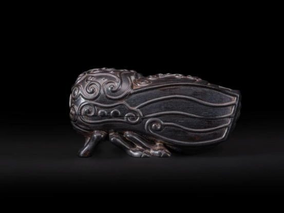 蟬型印盒尺寸精巧,表面鐫刻源自商周青銅的博古紋飾,蟬盒腹刻一“新”字,古韻與巧思兼備。