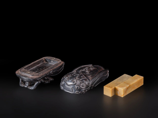 盲盒內藏兩方壽山石實用印章,壽山石對章色調沉穩大氣,質地溫潤凝結,其古樸韻味,與紫光檀的沉郁底色相得益彰。印章上刻天祿紋飾,寄寓福澤滿盈、辟邪納祥,雕刻風格遵循明清時期之古典美學簡約內斂,線條張力十足。