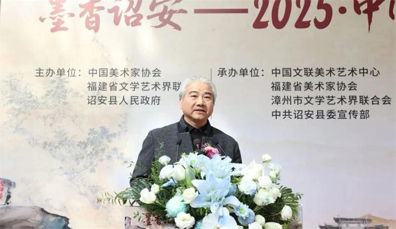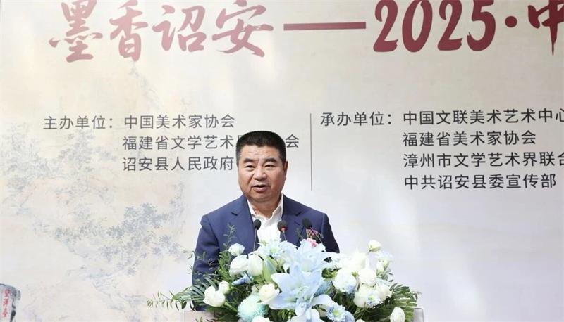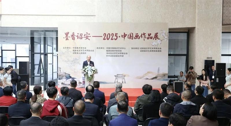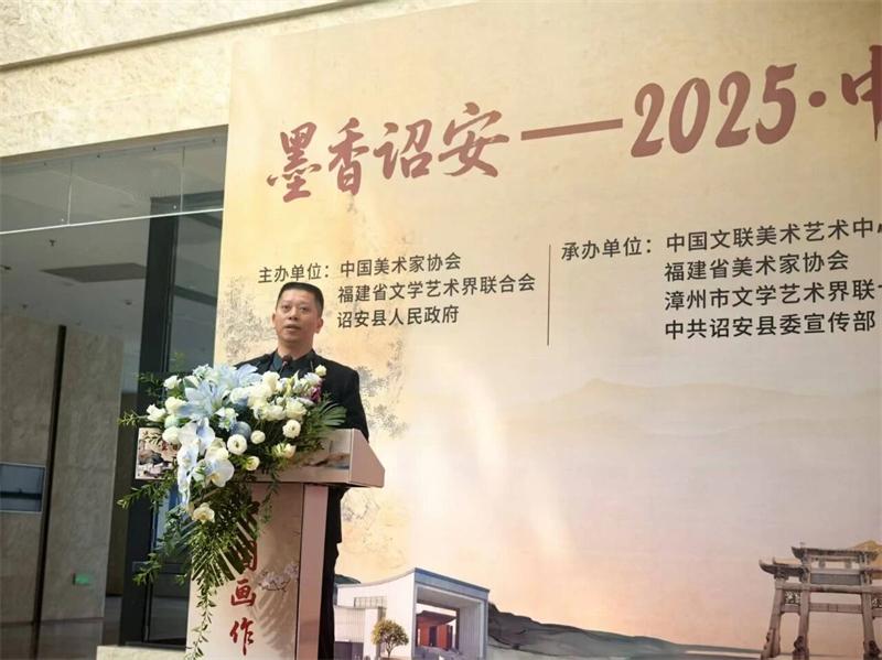 王來文對此次展覽的成功舉辦表示祝賀并宣布開幕。王來文在致辭中提到,“墨香詔安——2025·中國畫作品展”既是一場中國畫與詔安文脈的深情相擁,更是一次踐行習近平文化思想、推動中華優秀傳統文化創造性轉化、創新性發展的生動實踐。當前,全國上下正深入學習貫徹黨的二十大和二十屆歷次全會精神。新時代新征程,美術工作者肩負著“傳承中華優秀傳統文化、建設中華民族現代文明”的重大使命。詔安有著千年書畫基因,他希望以此次展覽為契機,創作出更多思想精深、藝術精湛、制作精良的精品力作,讓古老的文化瑰寶煥發新的時代光彩,以美術力量凝聚民族復興的磅礴動能。