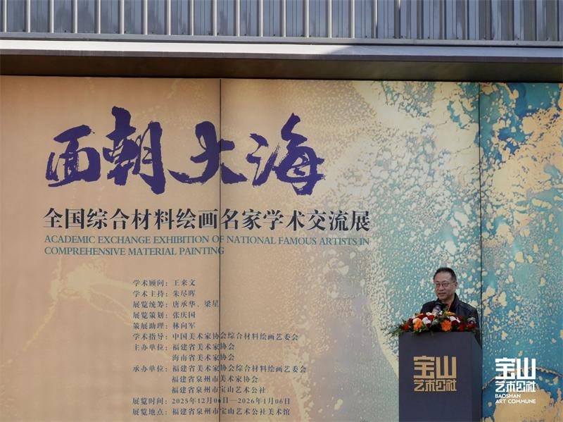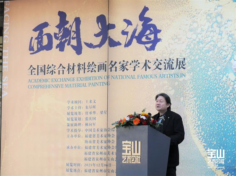 中國美協綜合材料繪畫藝委會主任、西安美術學院院長朱盡暉在致辭中,從學科前沿的高度系統梳理了綜合材料繪畫的發展脈絡。他指出,綜合材料繪畫所指向的不僅是媒介層面的“綜合”,更是一種立足中華文明根脈、面向當代與世界的文化視野。沒有深厚文化傳統的支撐,作品就會淪為單純的色彩與肌理堆疊;只有在數千年文明的縱深中汲取營養,藝術語言才能真正具有中國立場與世界表達。他表示,選擇在海絲起點泉州舉辦“面朝大海——2025 ? 全國綜合材料繪畫學術交流展”,正是看重其獨特的區域文化資源和開放包容的城市氣質。此次展覽與年會既是對近年綜合材料繪畫創作成果的一次系統檢閱,也是面向未來、推動這一學科不斷走向世界的重要發端。