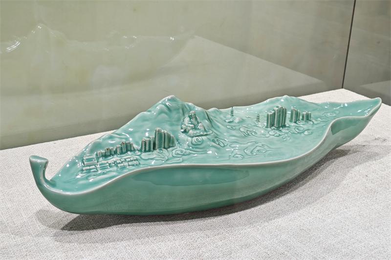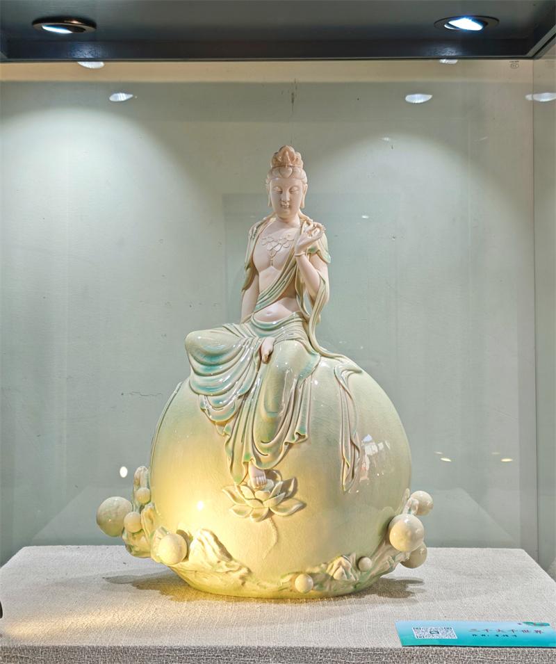 展覽現(xiàn)場,一件件青白相映的瓷器泛著溫潤光澤?!队续P來儀》青瓷刻畫花罐繼承宋元刻劃花工藝,并融入當(dāng)代審美;《四大觀音》等青瓷佛像瓷雕,突破以往南安國營瓷廠白瓷加彩的風(fēng)格,將青釉與瓷雕工藝創(chuàng)新結(jié)合;青瓷釉下彩《自在香器》則把釉下彩與雕塑手法融為一體,呈現(xiàn)出獨特的藝術(shù)語言,吸引了不少觀眾前來觀展。